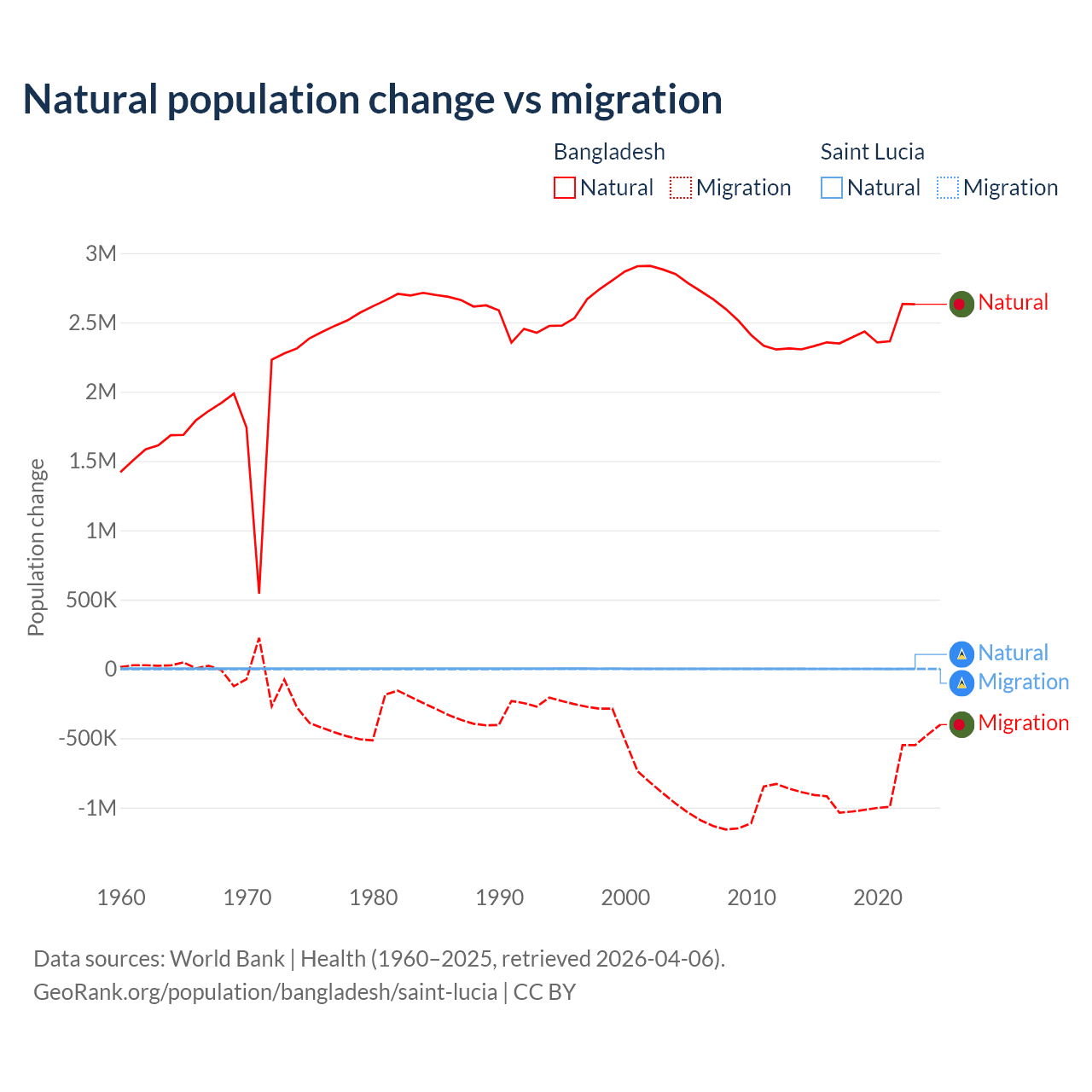 Over the last 10 years, 73.1% of the population change in Bangladesh is from natural causes (a gain of 24,148,039 people) and 26.9% is from migration (a loss of 8,897,408 people). In Saint Lucia 95.7% is from natural causes (a gain of 6,039 people) and 4.31% is from migration (a loss of 272 people).