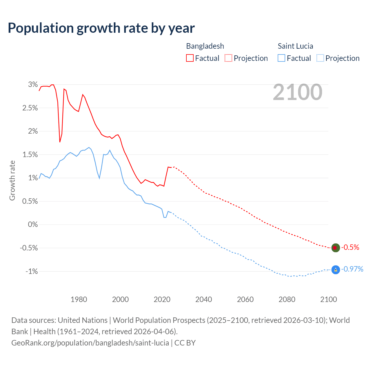 - For the last 10 years, Bangladesh has had an average growth rate of +0.94% per year vs +0.33% in Saint Lucia.