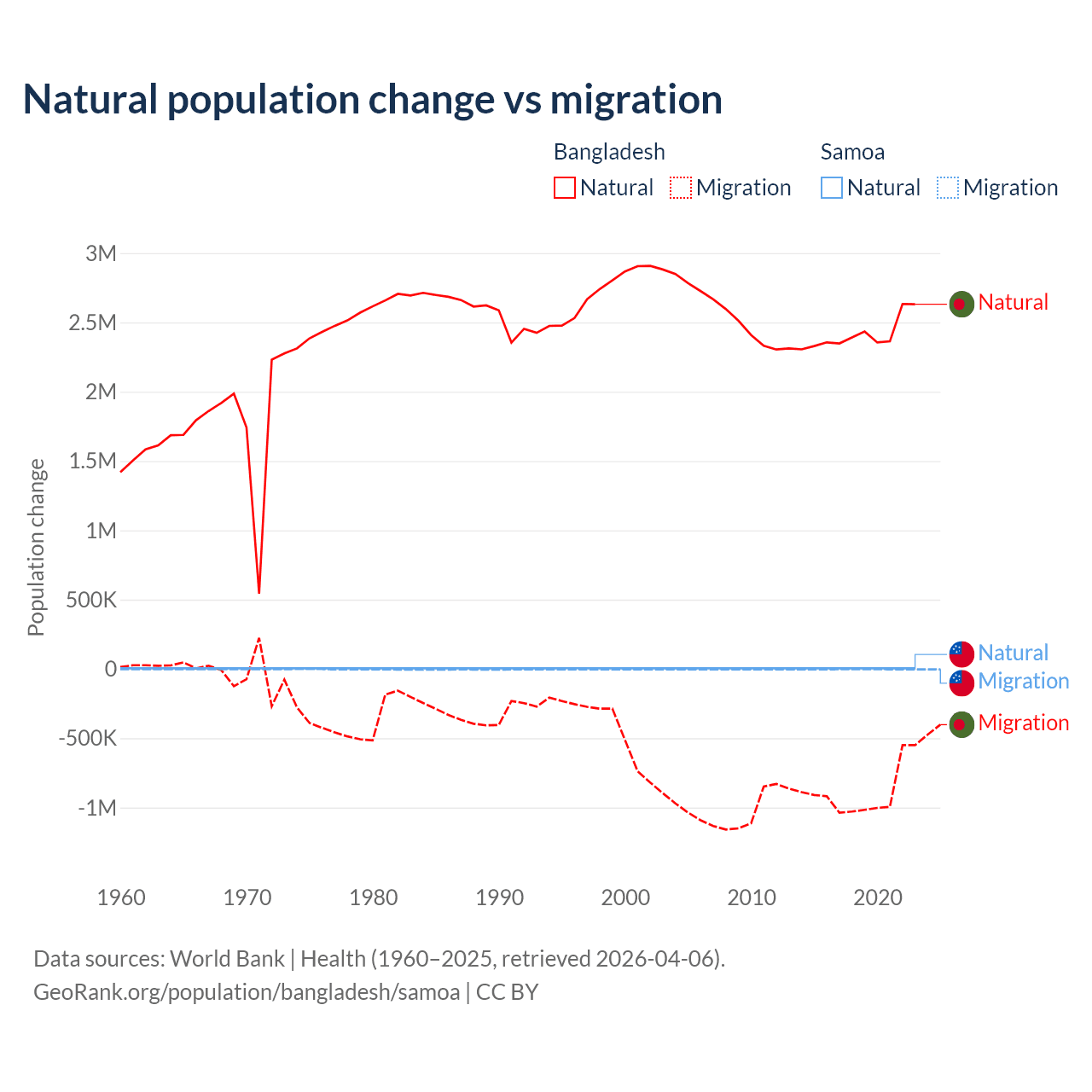 Over the last 10 years, 73.1% of the population change in Bangladesh is from natural causes (a gain of 24,148,039 people) and 26.9% is from migration (a loss of 8,897,408 people). In Samoa 62.5% is from natural causes (a gain of 45,436 people) and 37.5% is from migration (a loss of 27,246 people).