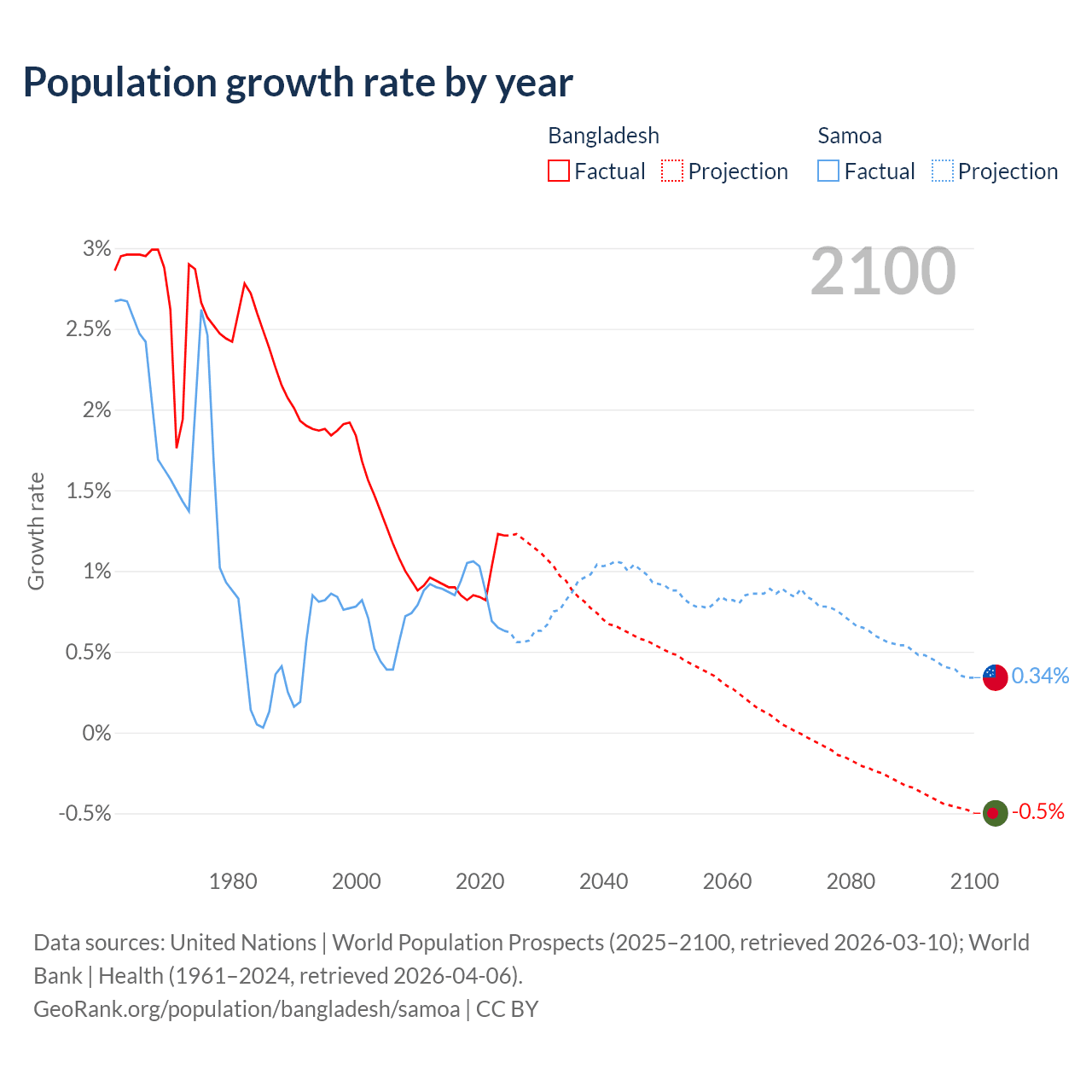 - For the last 10 years, Bangladesh has had an average growth rate of +0.94% per year vs +0.87% in Samoa.