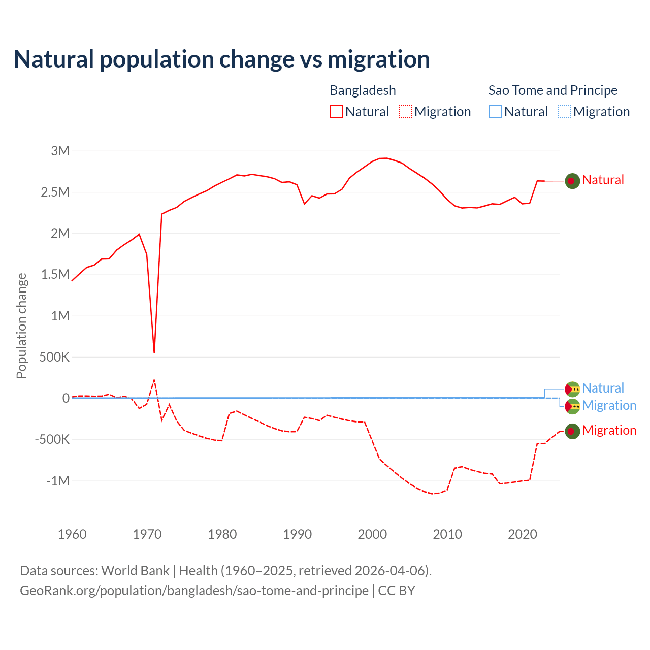 Over the last 10 years, 73.1% of the population change in Bangladesh is from natural causes (a gain of 24,148,039 people) and 26.9% is from migration (a loss of 8,897,408 people). In Sao Tome and Principe 80.1% is from natural causes (a gain of 50,822 people) and 19.9% is from migration (a loss of 12,621 people).
