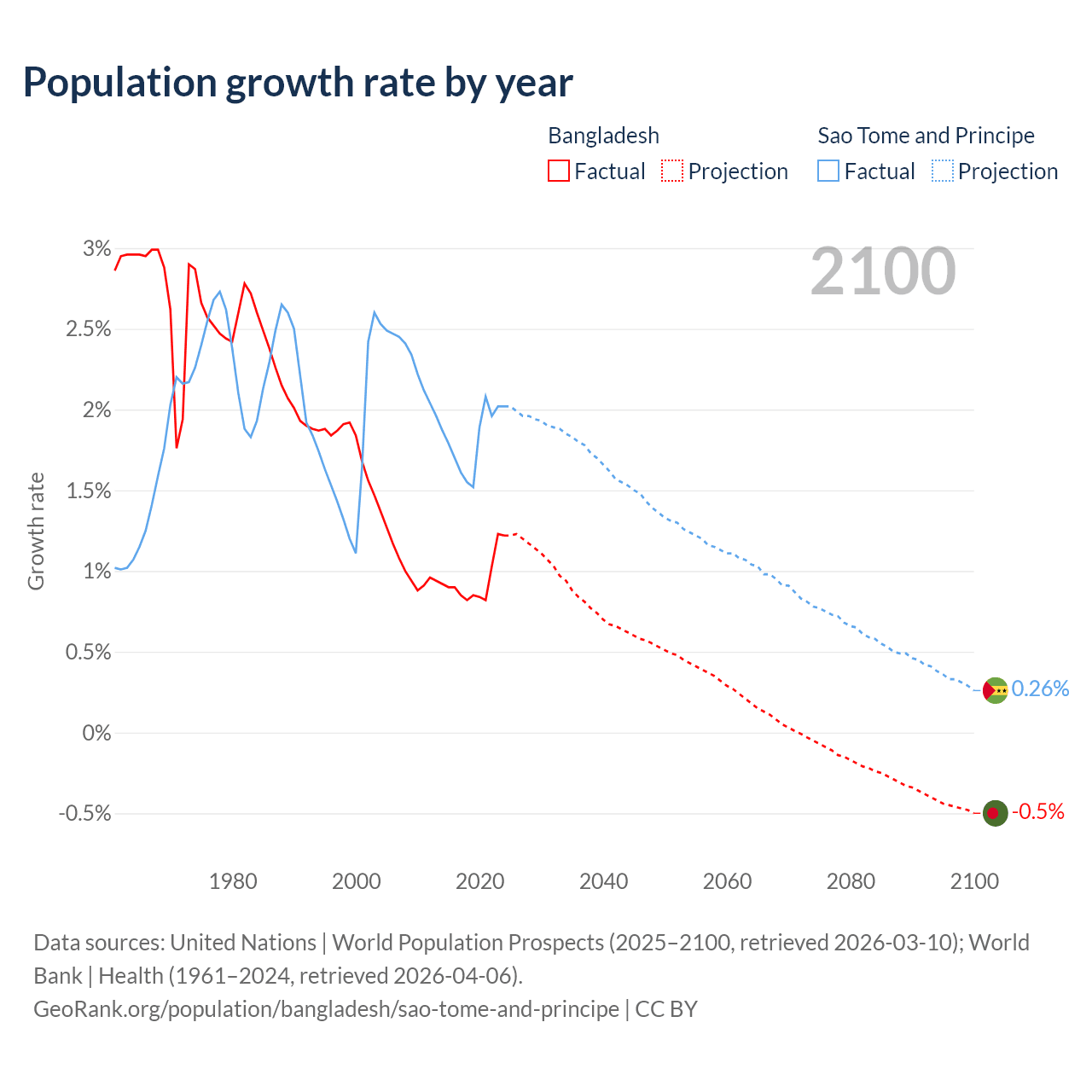 - For the last 10 years, Bangladesh has had an average growth rate of +0.94% per year vs +1.82% in Sao Tome and Principe.