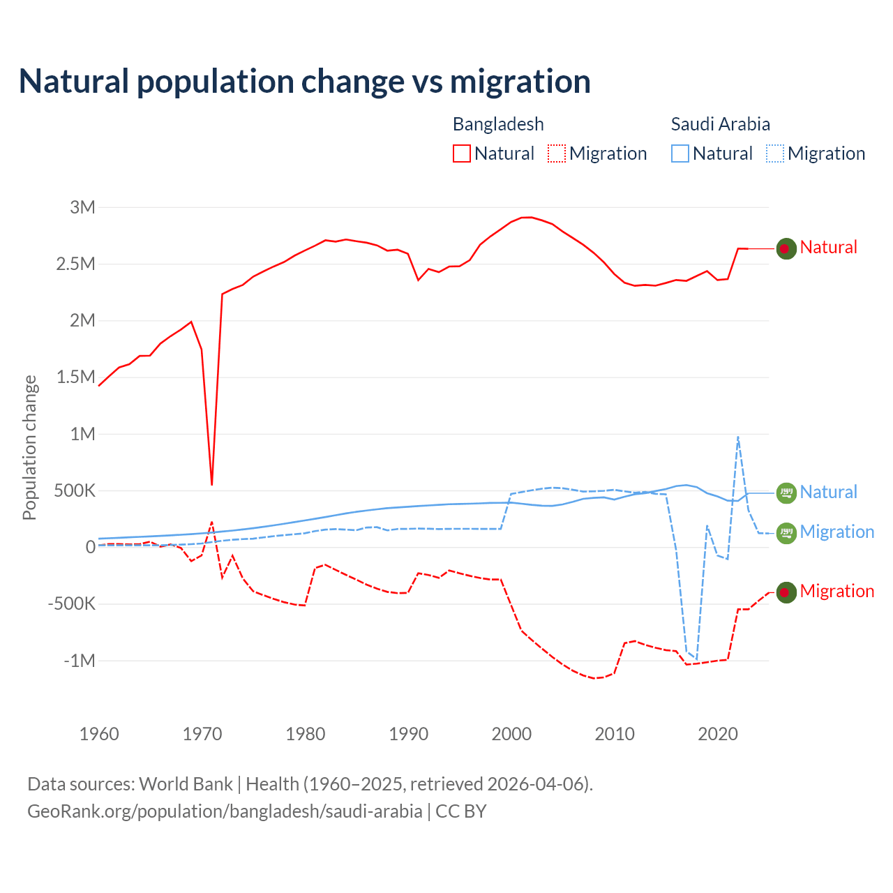 Over the last 10 years, 73.1% of the population change in Bangladesh is from natural causes (a gain of 24,148,039 people) and 26.9% is from migration (a loss of 8,897,408 people). In Saudi Arabia 93.9% is from natural causes (a gain of 4,829,562 people) and 6.05% is from migration (a gain of 311,209 people).
