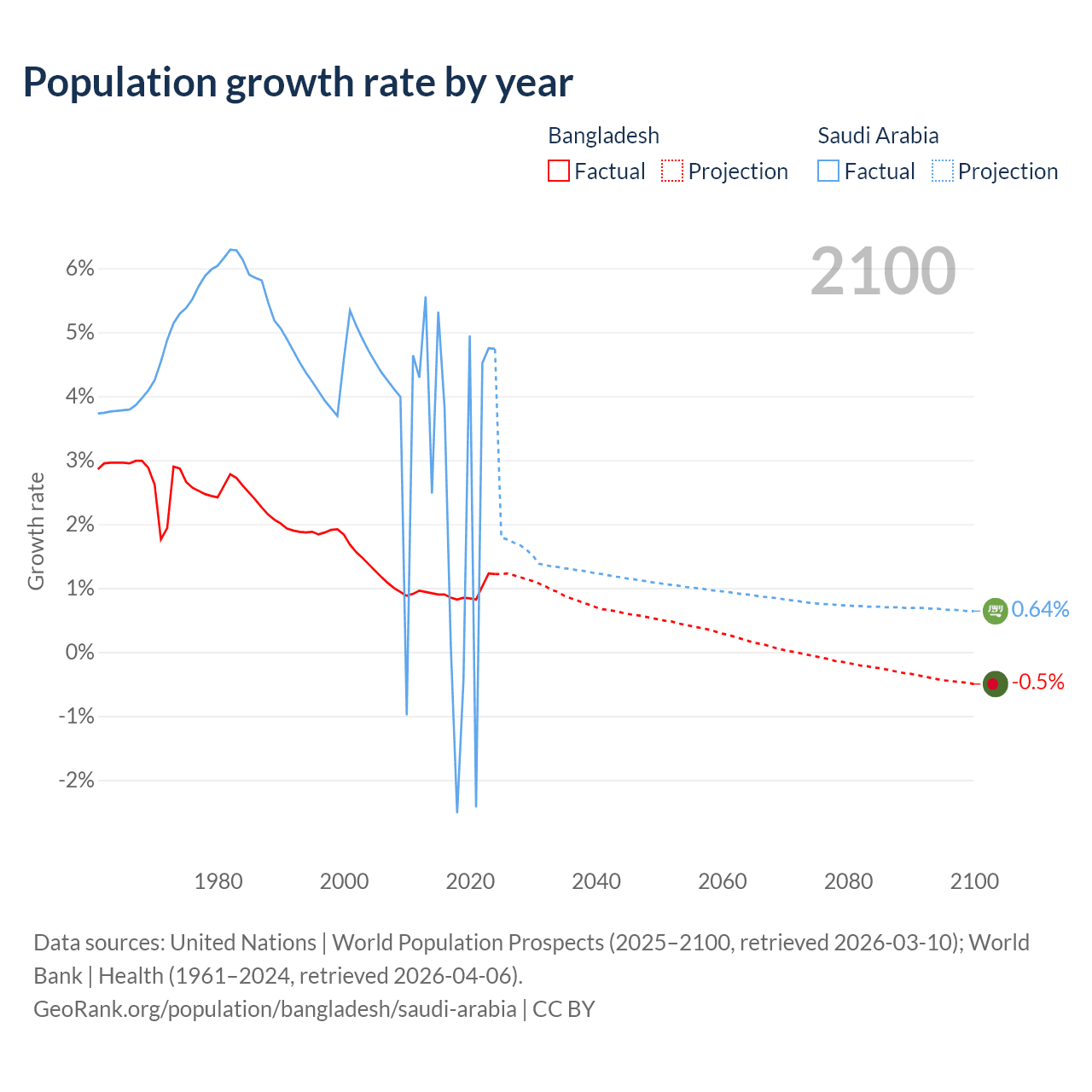 - For the last 10 years, Bangladesh has had an average growth rate of +0.94% per year vs +2.3% in Saudi Arabia.