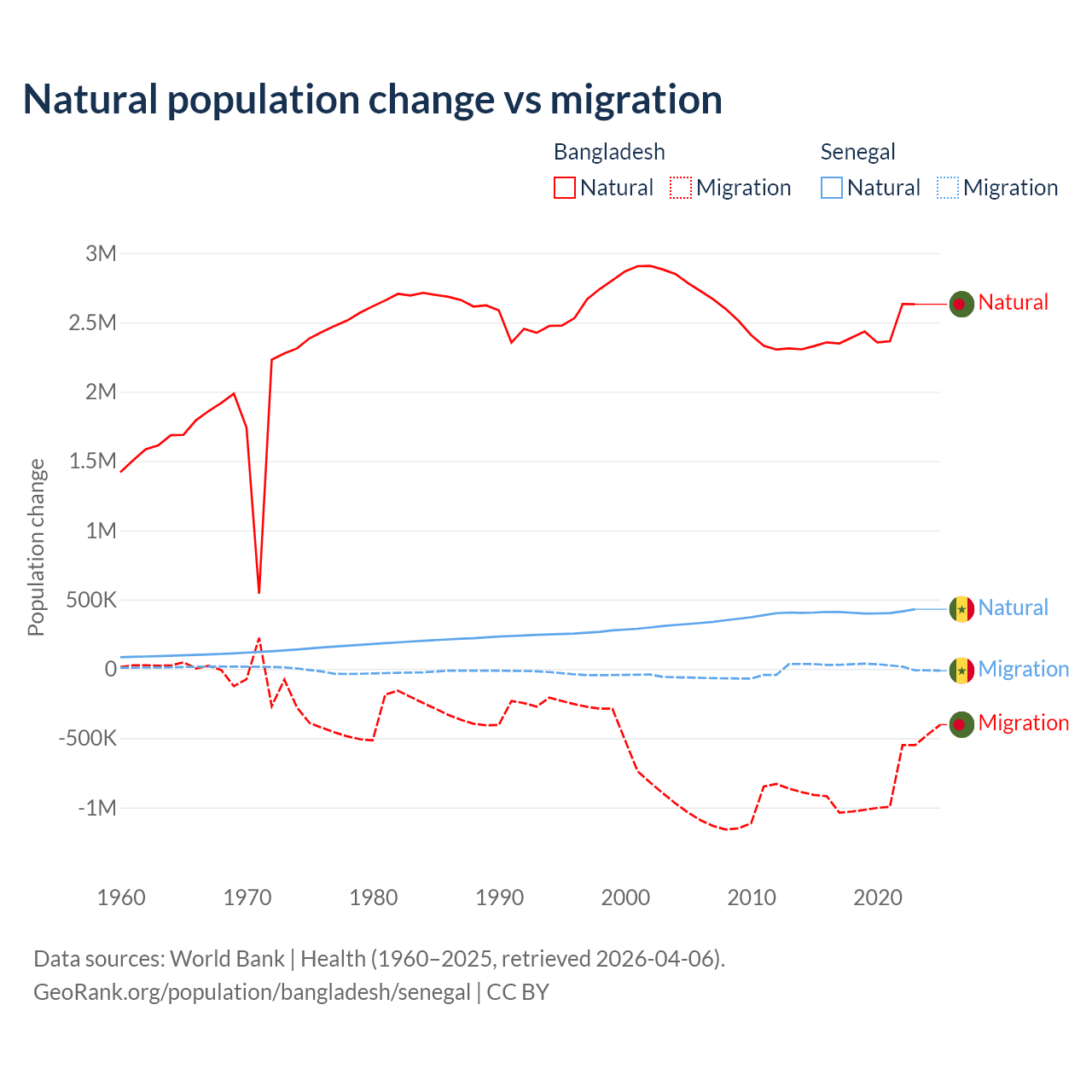 Over the last 10 years, 73.1% of the population change in Bangladesh is from natural causes (a gain of 24,148,039 people) and 26.9% is from migration (a loss of 8,897,408 people). In Senegal 93.9% is from natural causes (a gain of 4,089,205 people) and 6.13% is from migration (a gain of 267,266 people).