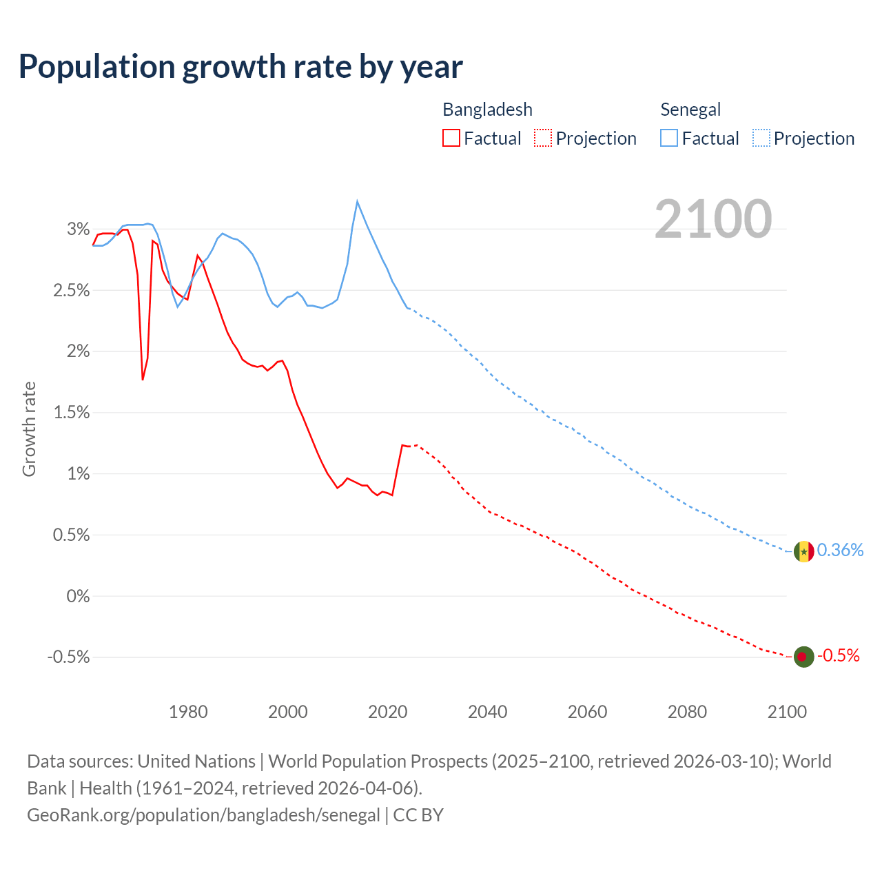 - For the last 10 years, Bangladesh has had an average growth rate of +0.94% per year vs +2.76% in Senegal.