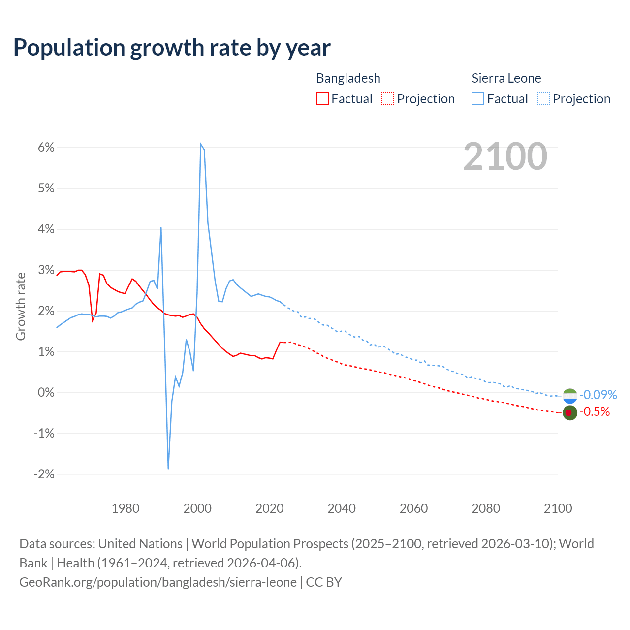 - For the last 10 years, Bangladesh has had an average growth rate of +0.94% per year vs +2.32% in Sierra Leone.