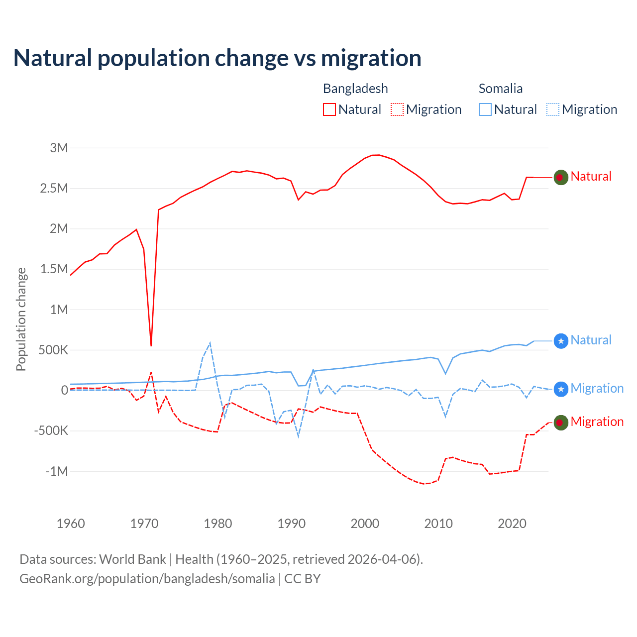 Over the last 10 years, 73.1% of the population change in Bangladesh is from natural causes (a gain of 24,148,039 people) and 26.9% is from migration (a loss of 8,897,408 people). In Somalia 94.4% is from natural causes (a gain of 5,270,105 people) and 5.58% is from migration (a gain of 311,487 people).