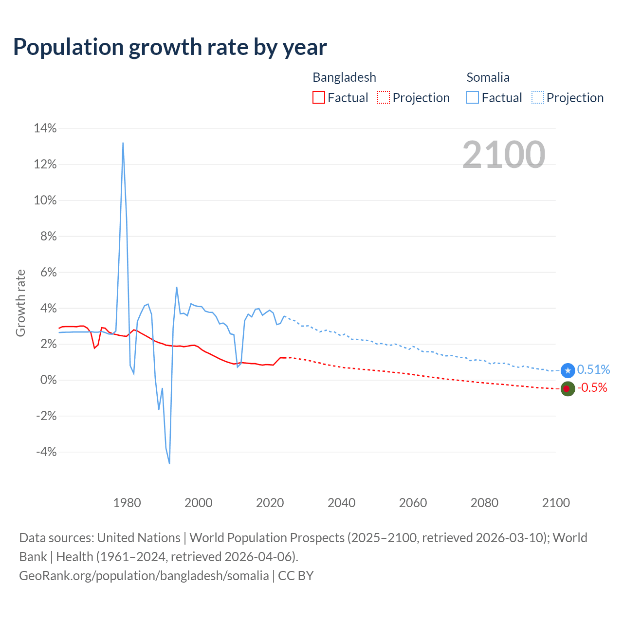 - For the last 10 years, Bangladesh has had an average growth rate of +0.94% per year vs +3.61% in Somalia.