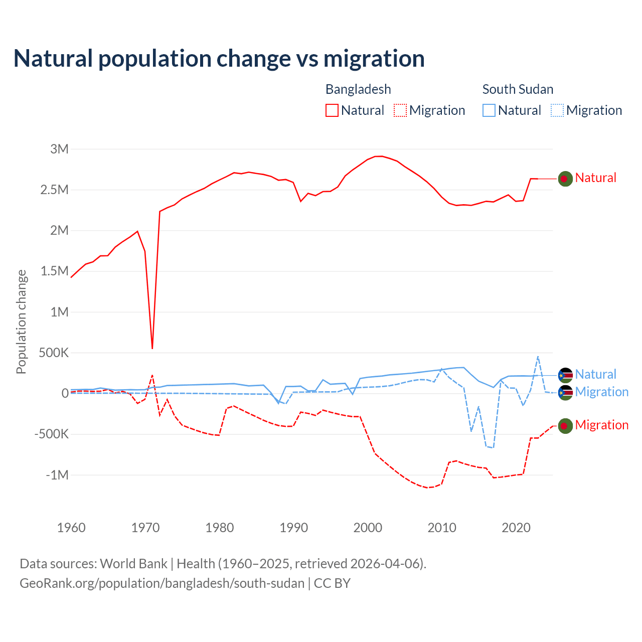 Over the last 10 years, 73.1% of the population change in Bangladesh is from natural causes (a gain of 24,148,039 people) and 26.9% is from migration (a loss of 8,897,408 people). In South Sudan 57.4% is from natural causes (a gain of 1,792,135 people) and 42.6% is from migration (a loss of 1,329,606 people).