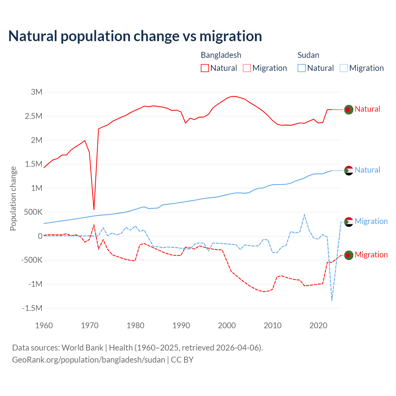 Over the last 10 years, 73.1% of the population change in Bangladesh is from natural causes (a gain of 24,148,039 people) and 26.9% is from migration (a loss of 8,897,408 people). In Sudan 95.1% is from natural causes (a gain of 12,459,977 people) and 4.88% is from migration (a loss of 639,596 people).