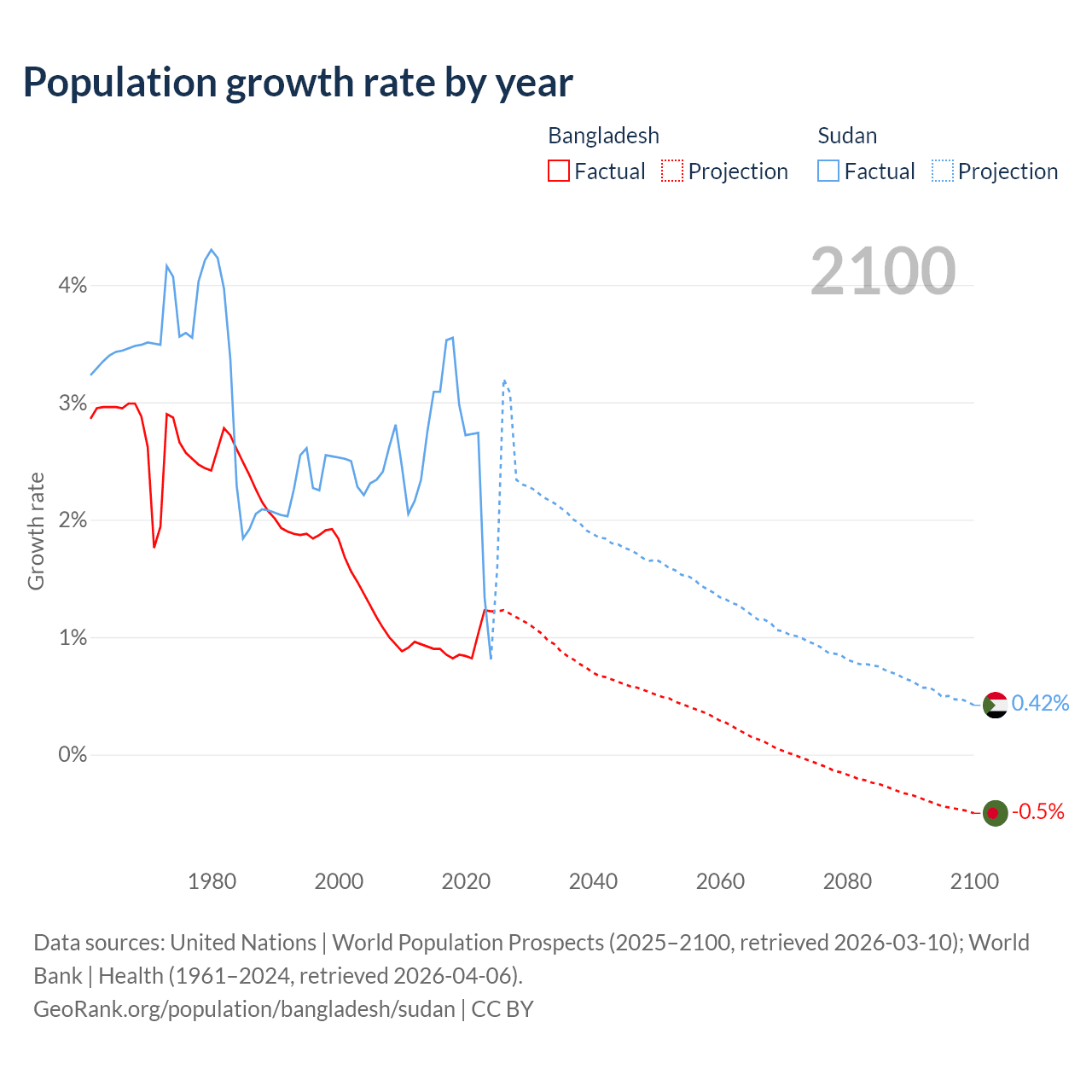 - For the last 10 years, Bangladesh has had an average growth rate of +0.94% per year vs +2.67% in Sudan.