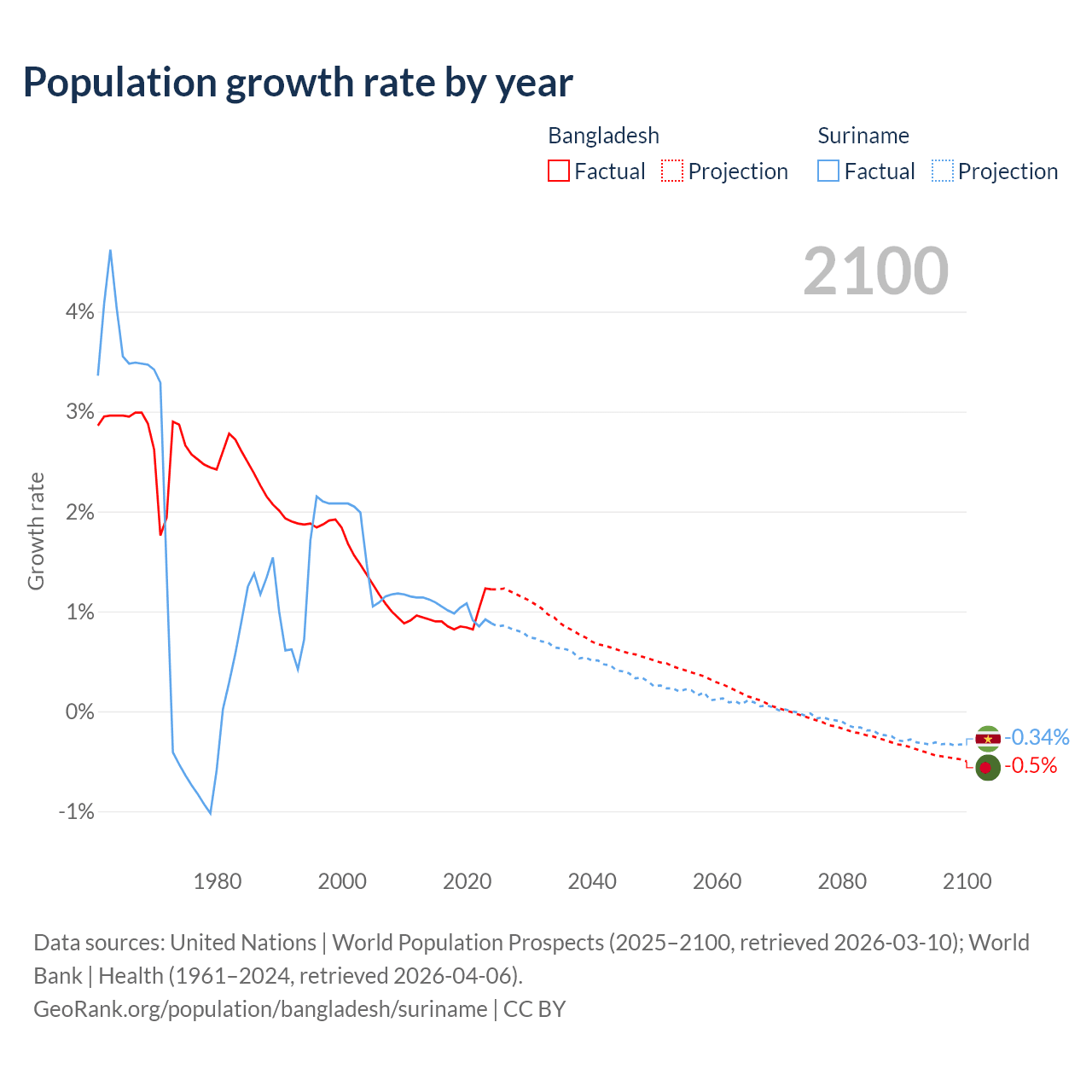 - For the last 10 years, Bangladesh has had an average growth rate of +0.94% per year vs +0.99% in Suriname.