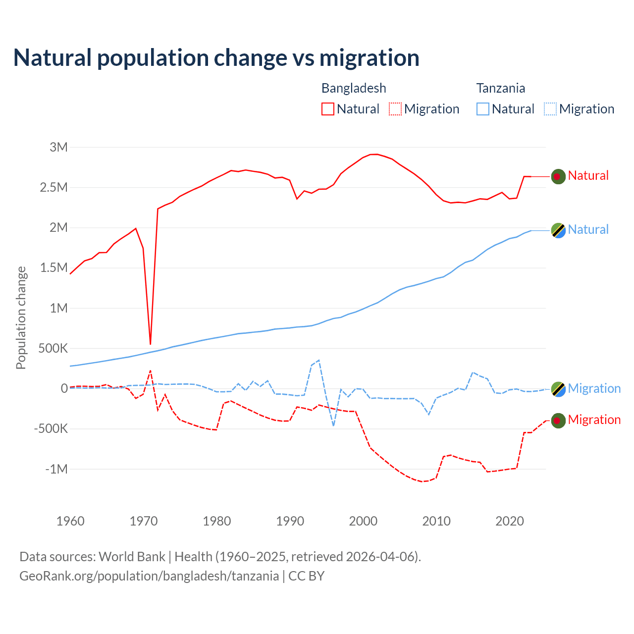Over the last 10 years, 73.1% of the population change in Bangladesh is from natural causes (a gain of 24,148,039 people) and 26.9% is from migration (a loss of 8,897,408 people). In Tanzania 98.7% is from natural causes (a gain of 17,769,541 people) and 1.27% is from migration (a gain of 229,466 people).