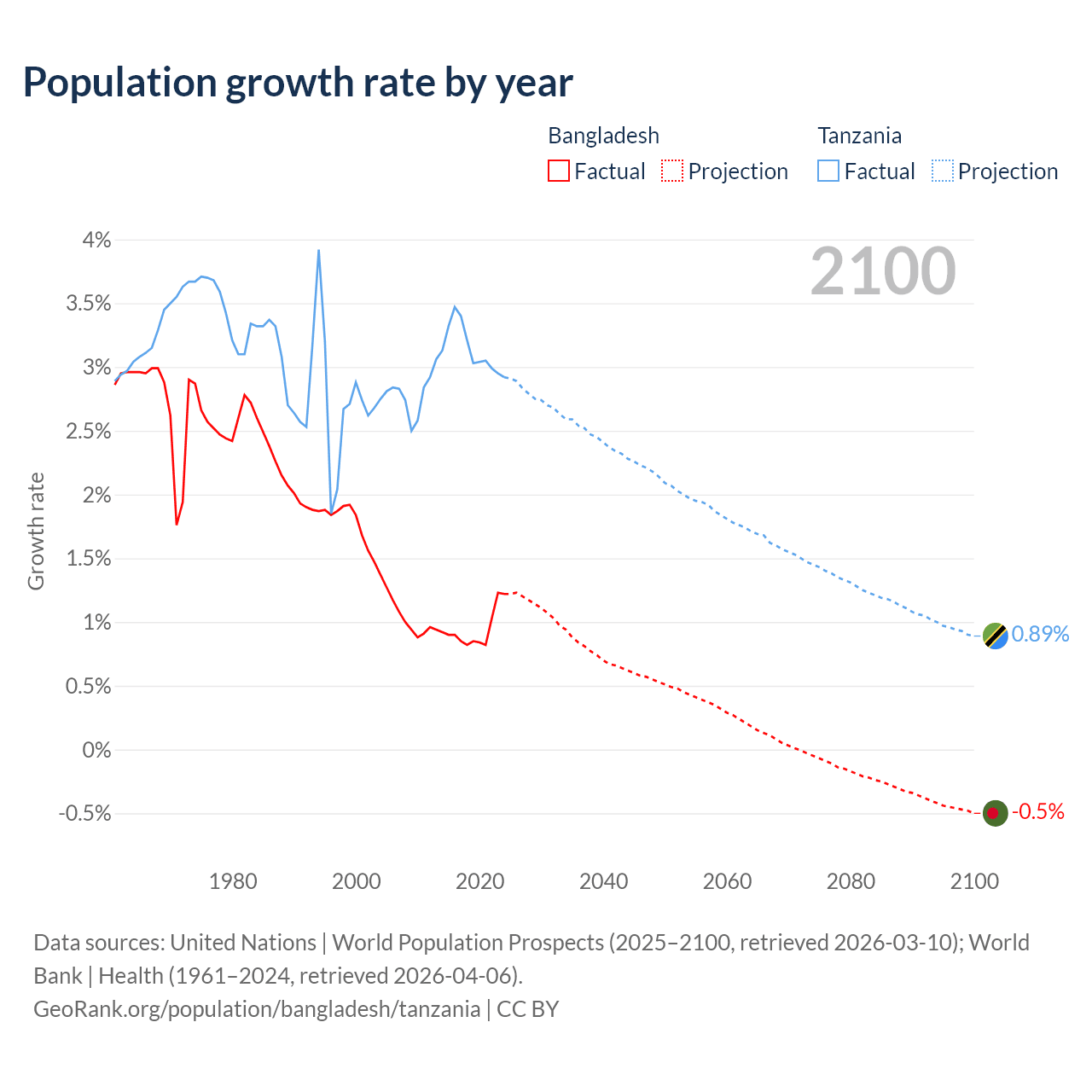 - For the last 10 years, Bangladesh has had an average growth rate of +0.94% per year vs +3.13% in Tanzania.