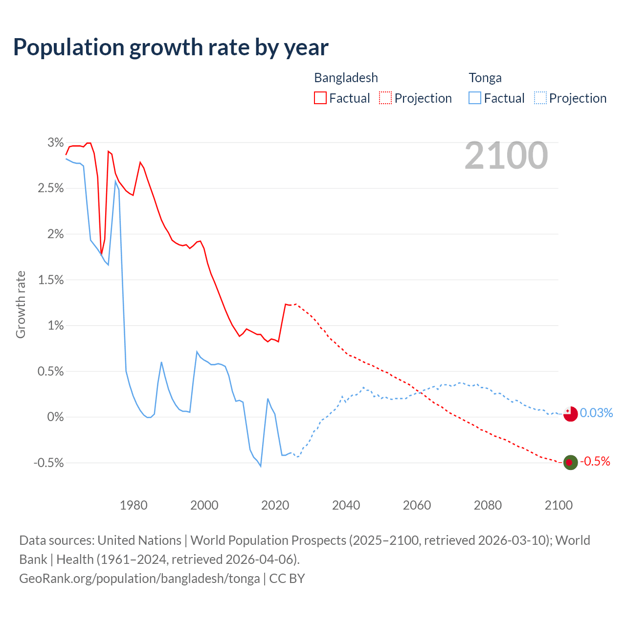 - For the last 10 years, Bangladesh has had an average growth rate of +0.94% per year vs -0.25% in Tonga.