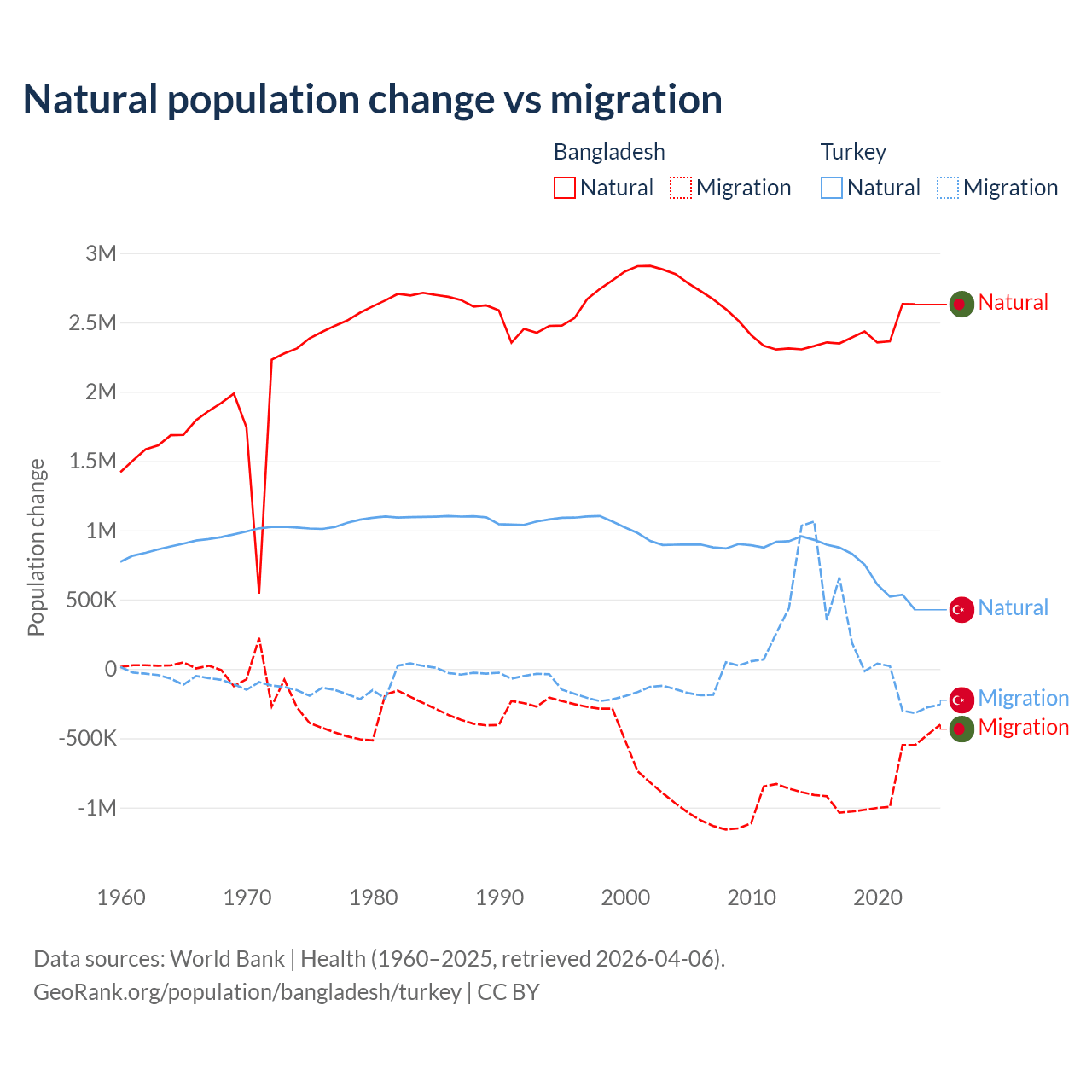 Over the last 10 years, 73.1% of the population change in Bangladesh is from natural causes (a gain of 24,148,039 people) and 26.9% is from migration (a loss of 8,897,408 people). In Turkey 73% is from natural causes (a gain of 7,333,352 people) and 27% is from migration (a gain of 2,718,916 people).