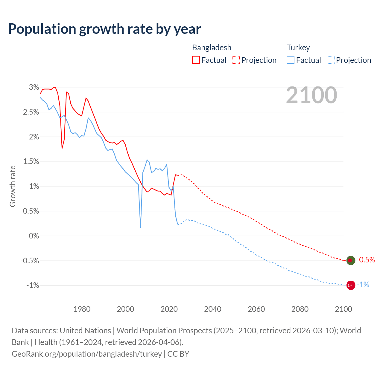 - For the last 10 years, Bangladesh has had an average growth rate of +0.94% per year vs +1.06% in Turkey.
