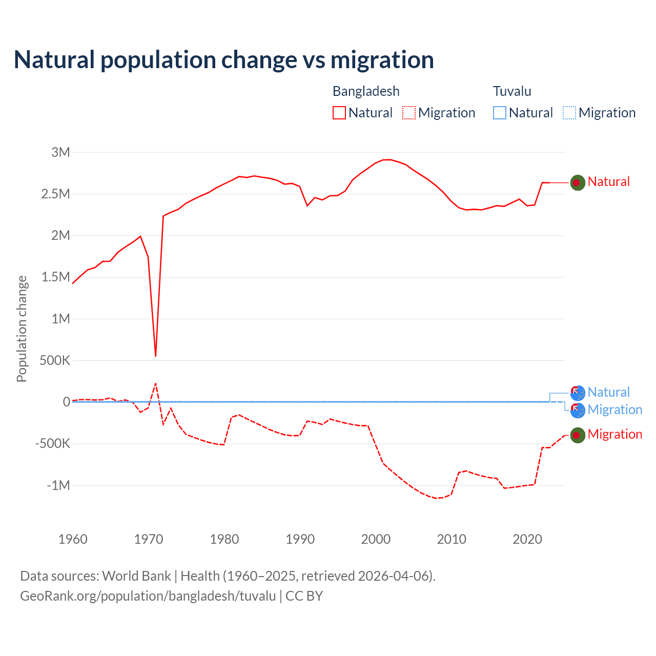 Over the last 10 years, 73.1% of the population change in Bangladesh is from natural causes (a gain of 24,148,039 people) and 26.9% is from migration (a loss of 8,897,408 people). In Tuvalu 35.5% is from natural causes (a gain of 1,556 people) and 64.5% is from migration (a loss of 2,827 people).