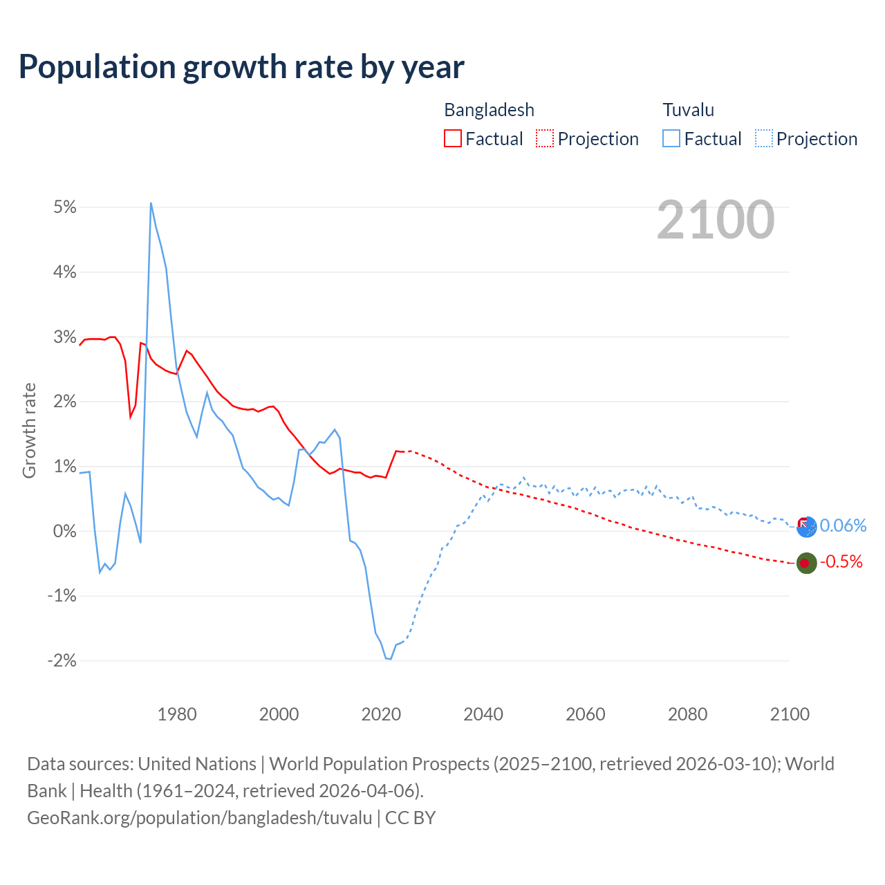 - For the last 10 years, Bangladesh has had an average growth rate of +0.94% per year vs -1.19% in Tuvalu.