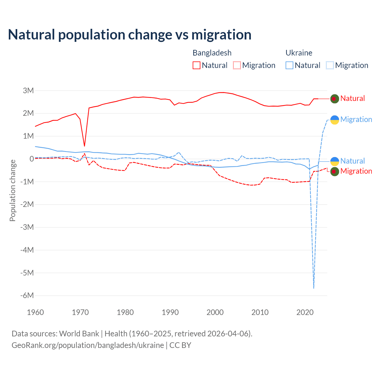 Over the last 10 years, 73.1% of the population change in Bangladesh is from natural causes (a gain of 24,148,039 people) and 26.9% is from migration (a loss of 8,897,408 people). In Ukraine 28.2% is from natural causes (a loss of 2,435,153 people) and 71.8% is from migration (a loss of 6,198,995 people).