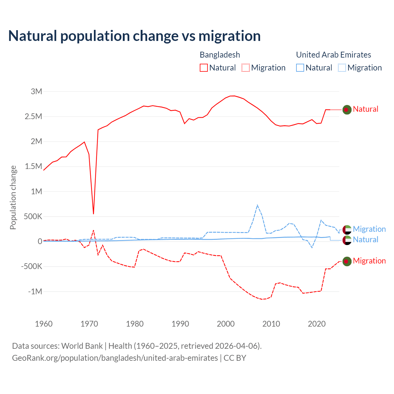 Over the last 10 years, 73.1% of the population change in Bangladesh is from natural causes (a gain of 24,148,039 people) and 26.9% is from migration (a loss of 8,897,408 people). In the United Arab Emirates 30.5% is from natural causes (a gain of 857,996 people) and 69.5% is from migration (a gain of 1,958,520 people).