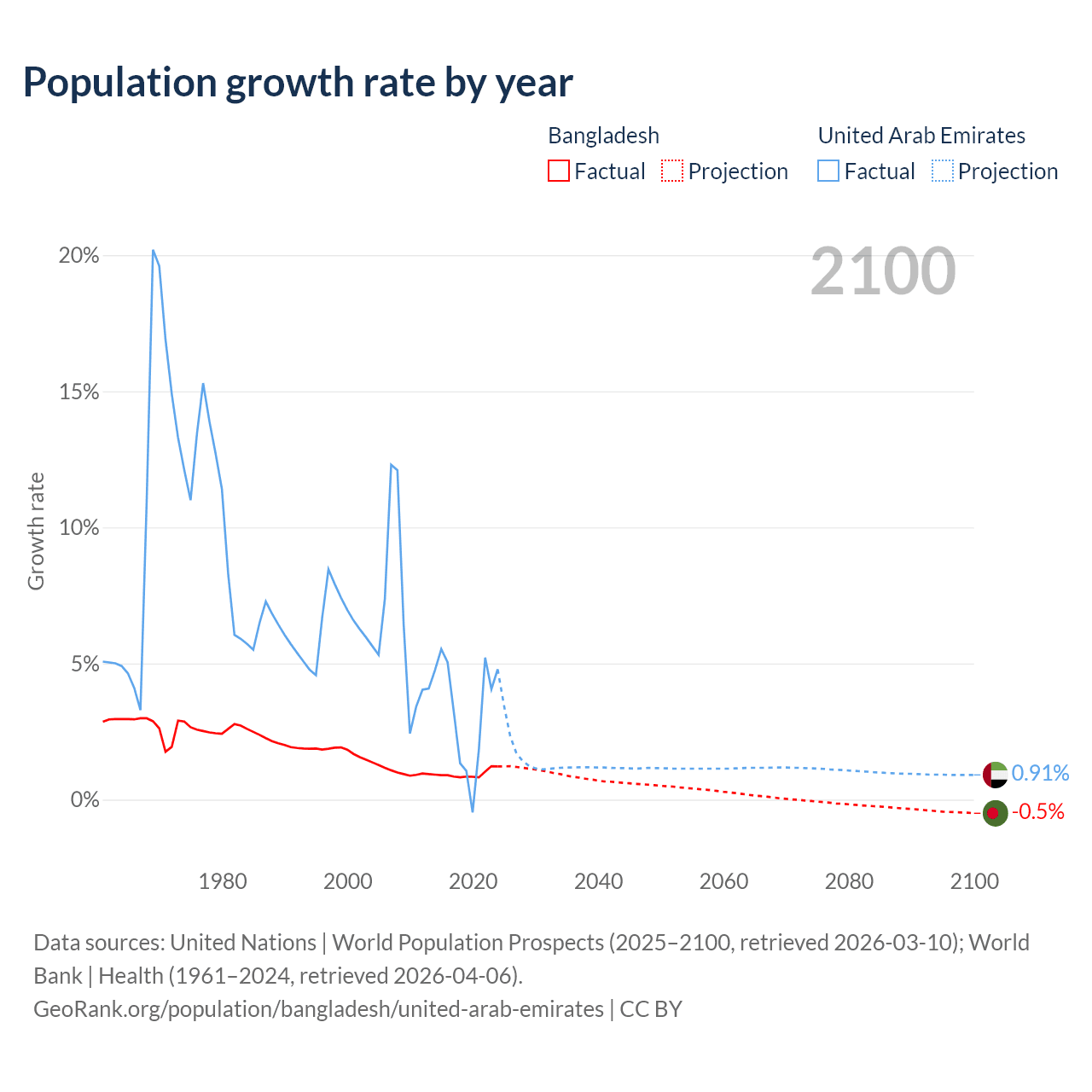 - For the last 10 years, Bangladesh has had an average growth rate of +0.94% per year vs +3.31% in the United Arab Emirates.