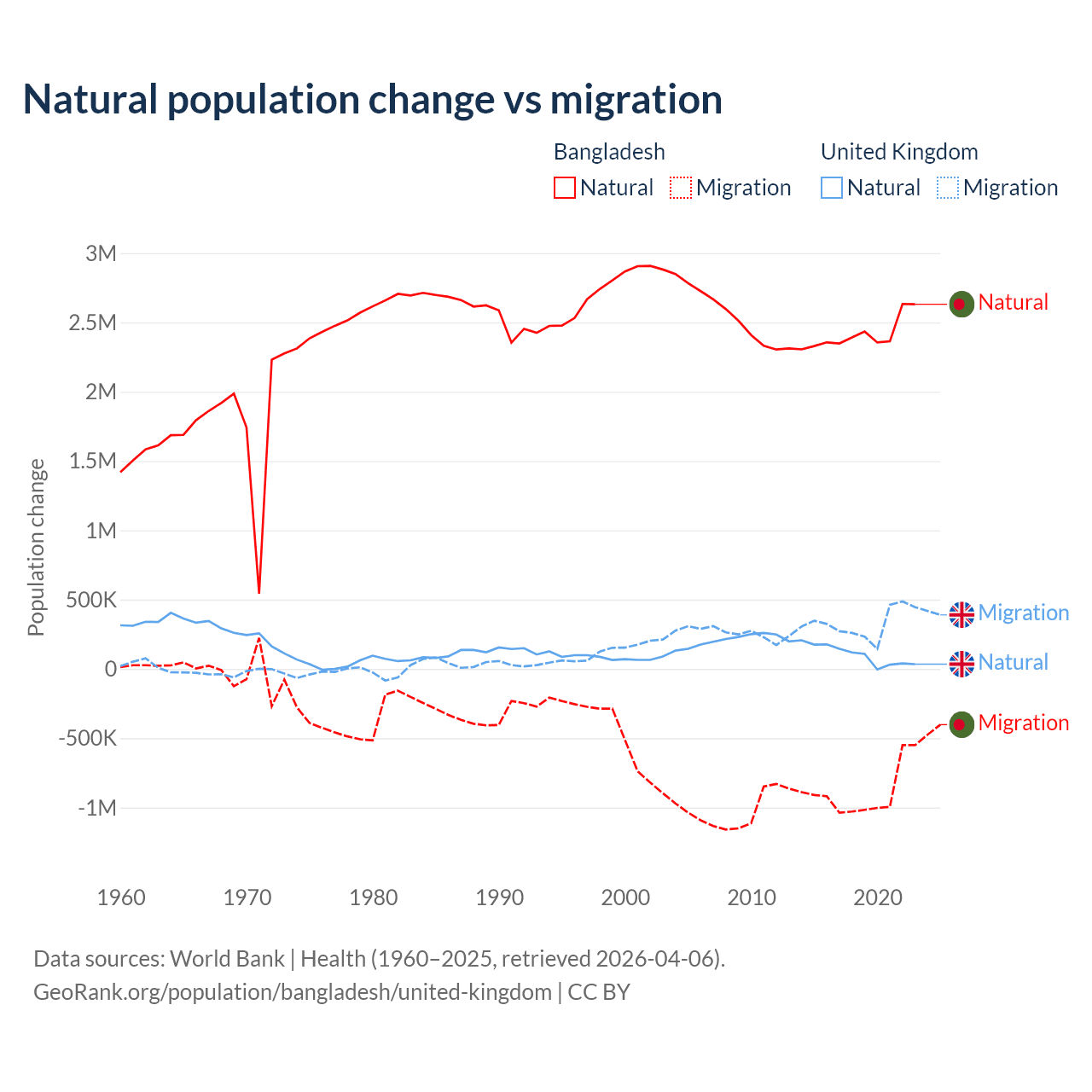 Over the last 10 years, 73.1% of the population change in Bangladesh is from natural causes (a gain of 24,148,039 people) and 26.9% is from migration (a loss of 8,897,408 people). In the United Kingdom 23.9% is from natural causes (a gain of 1,033,129 people) and 76.1% is from migration (a gain of 3,283,101 people).