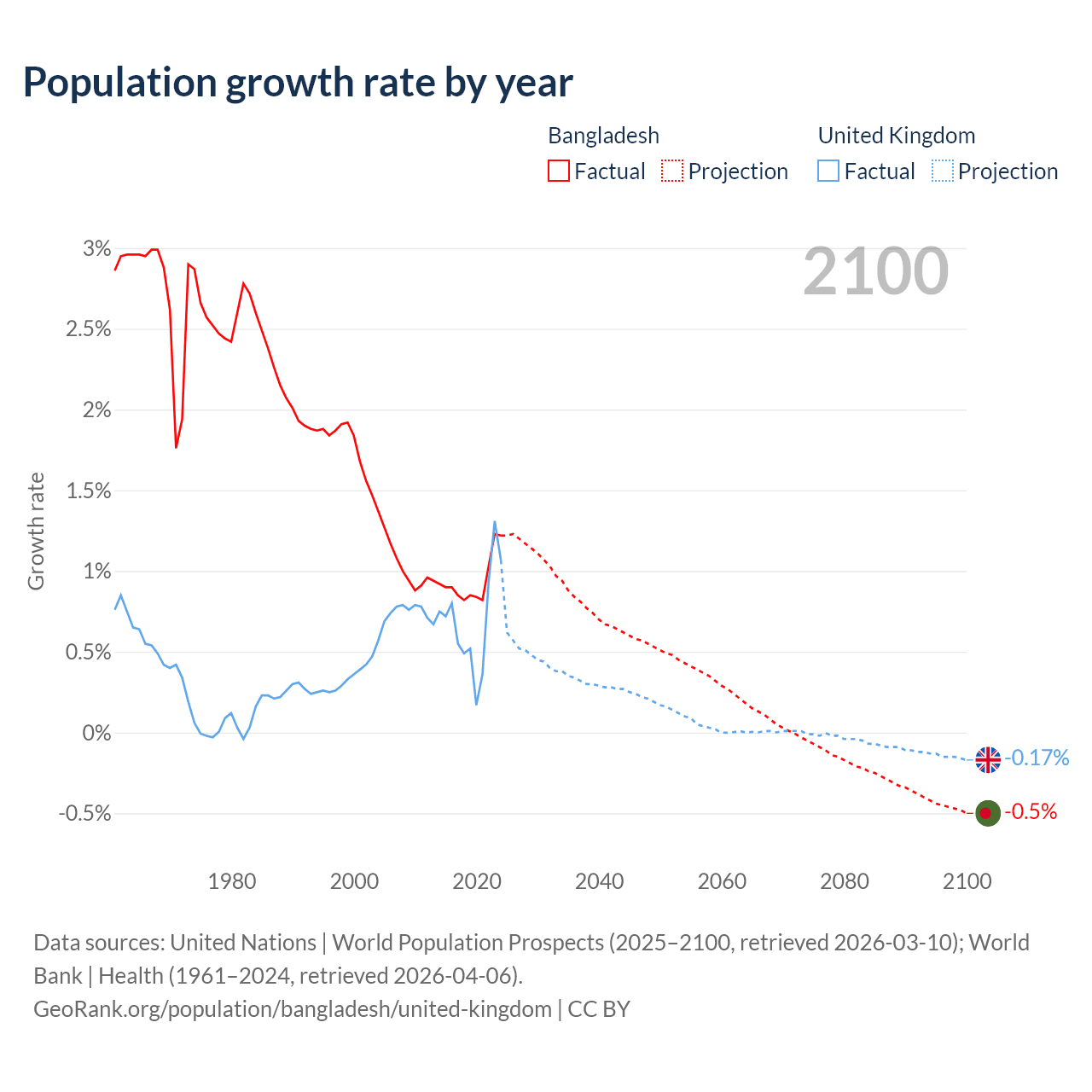 - For the last 10 years, Bangladesh has had an average growth rate of +0.94% per year vs +0.7% in the United Kingdom.