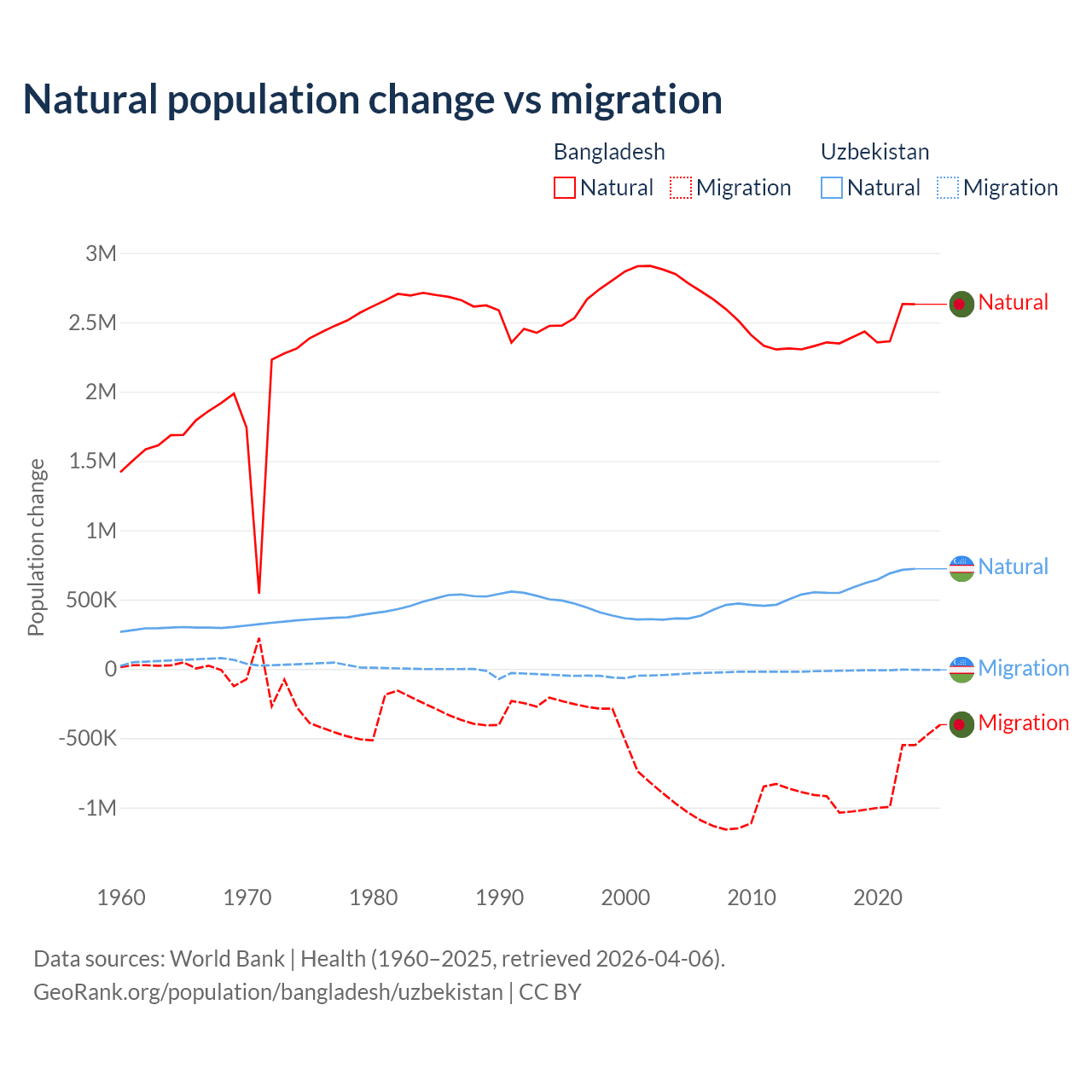 Over the last 10 years, 73.1% of the population change in Bangladesh is from natural causes (a gain of 24,148,039 people) and 26.9% is from migration (a loss of 8,897,408 people). In Uzbekistan 98.2% is from natural causes (a gain of 6,161,117 people) and 1.84% is from migration (a loss of 115,398 people).
