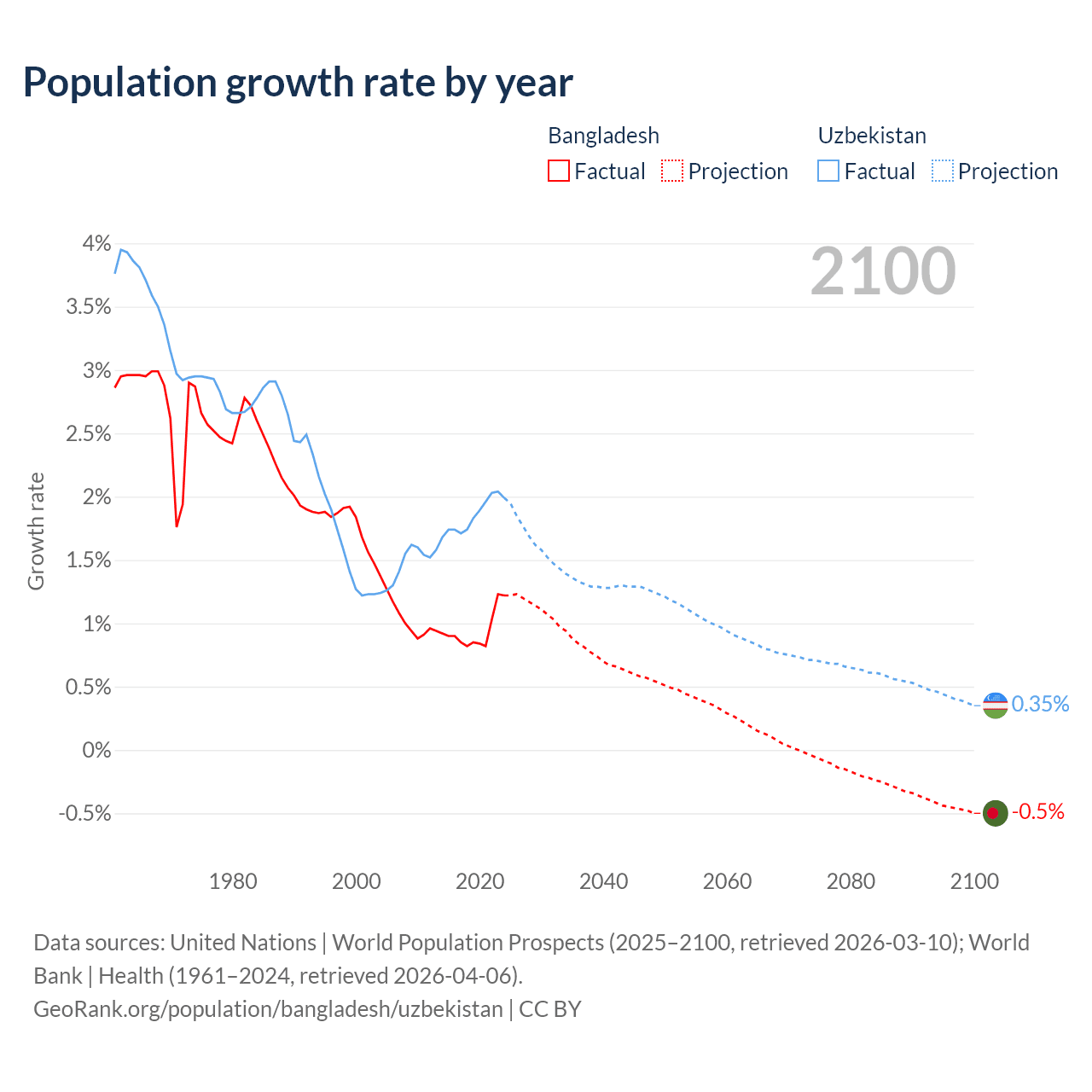 - For the last 10 years, Bangladesh has had an average growth rate of +0.94% per year vs +1.85% in Uzbekistan.