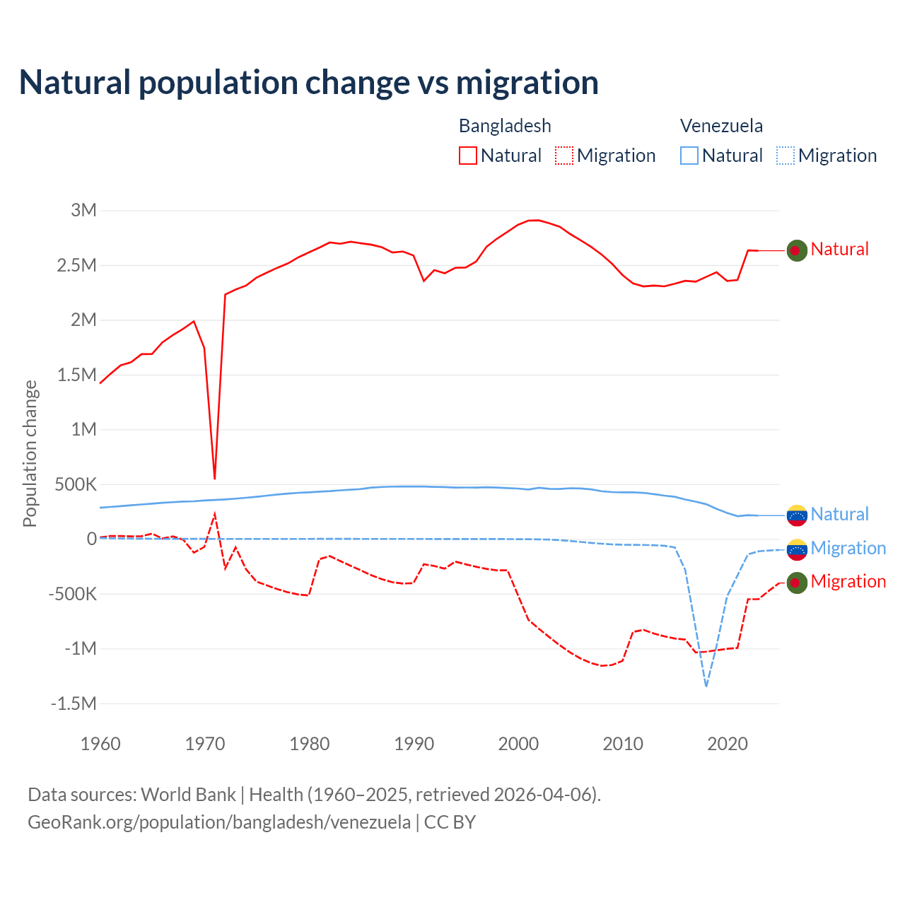 Over the last 10 years, 73.1% of the population change in Bangladesh is from natural causes (a gain of 24,148,039 people) and 26.9% is from migration (a loss of 8,897,408 people). In Venezuela 38.6% is from natural causes (a gain of 2,946,257 people) and 61.4% is from migration (a loss of 4,683,227 people).