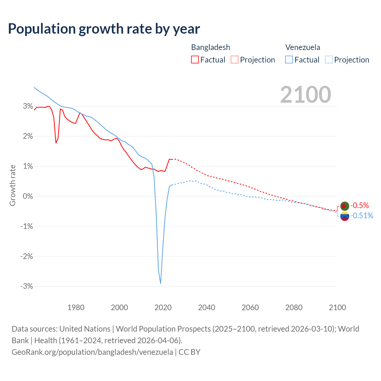 - For the last 10 years, Bangladesh has had an average growth rate of +0.94% per year vs -0.46% in Venezuela.