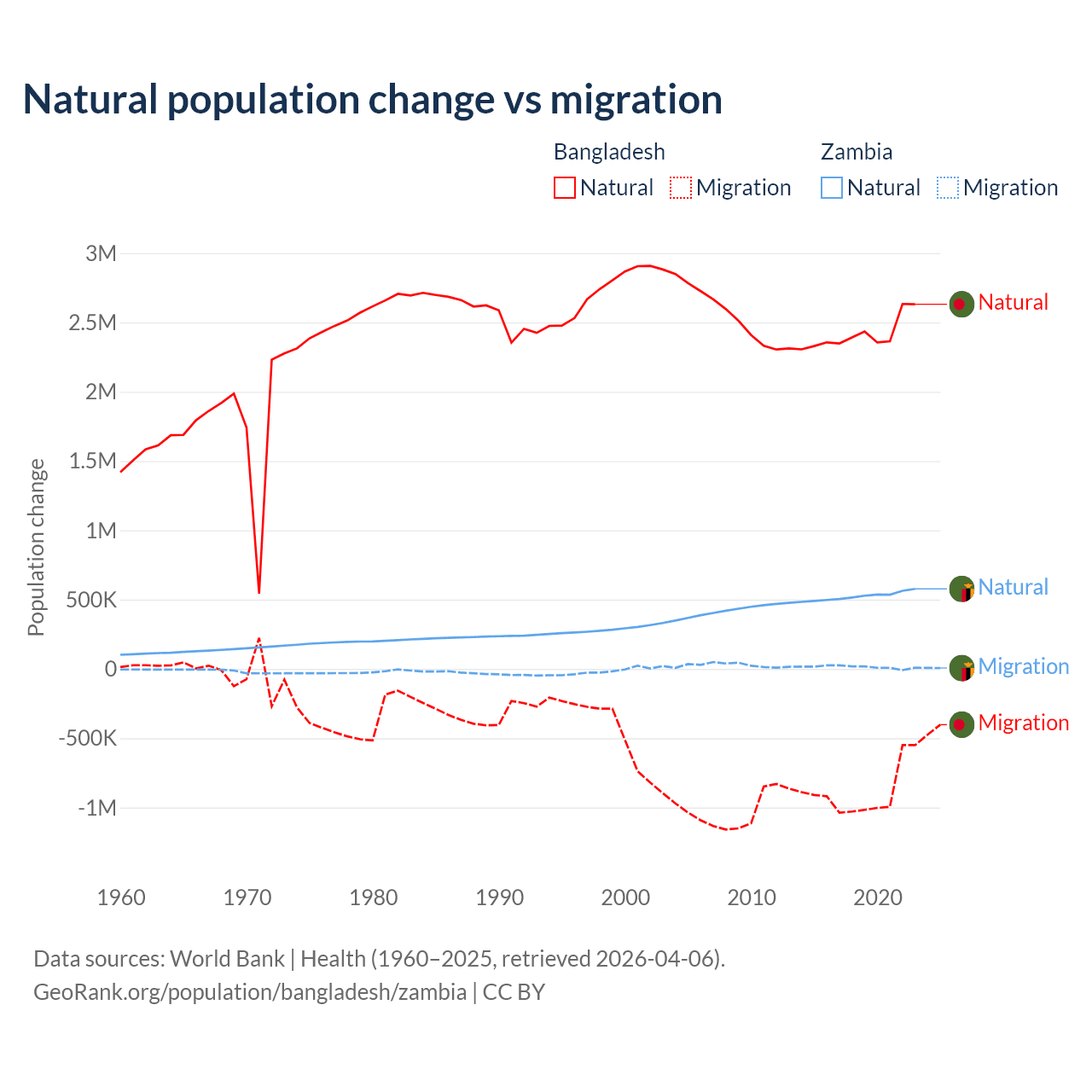 Over the last 10 years, 73.1% of the population change in Bangladesh is from natural causes (a gain of 24,148,039 people) and 26.9% is from migration (a loss of 8,897,408 people). In Zambia 97.4% is from natural causes (a gain of 5,233,797 people) and 2.58% is from migration (a gain of 138,554 people).