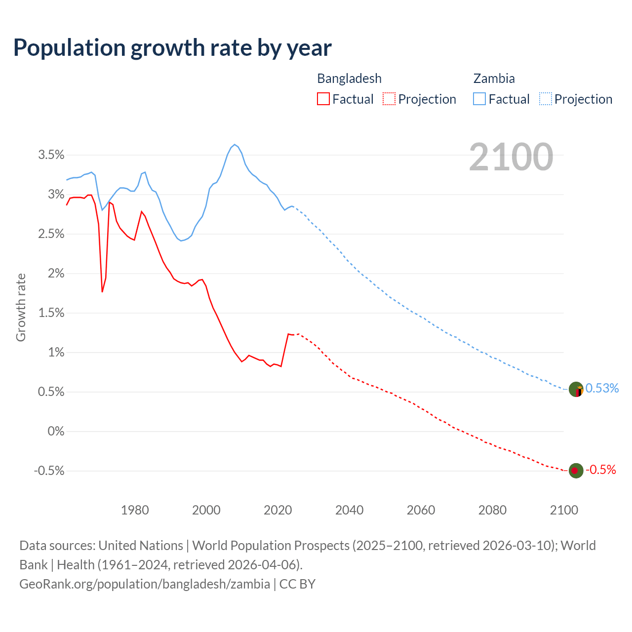 - For the last 10 years, Bangladesh has had an average growth rate of +0.94% per year vs +3% in Zambia.
