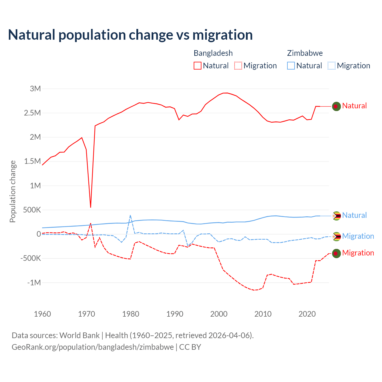 Over the last 10 years, 73.1% of the population change in Bangladesh is from natural causes (a gain of 24,148,039 people) and 26.9% is from migration (a loss of 8,897,408 people). In Zimbabwe 74.9% is from natural causes (a gain of 3,558,487 people) and 25.1% is from migration (a loss of 1,192,807 people).