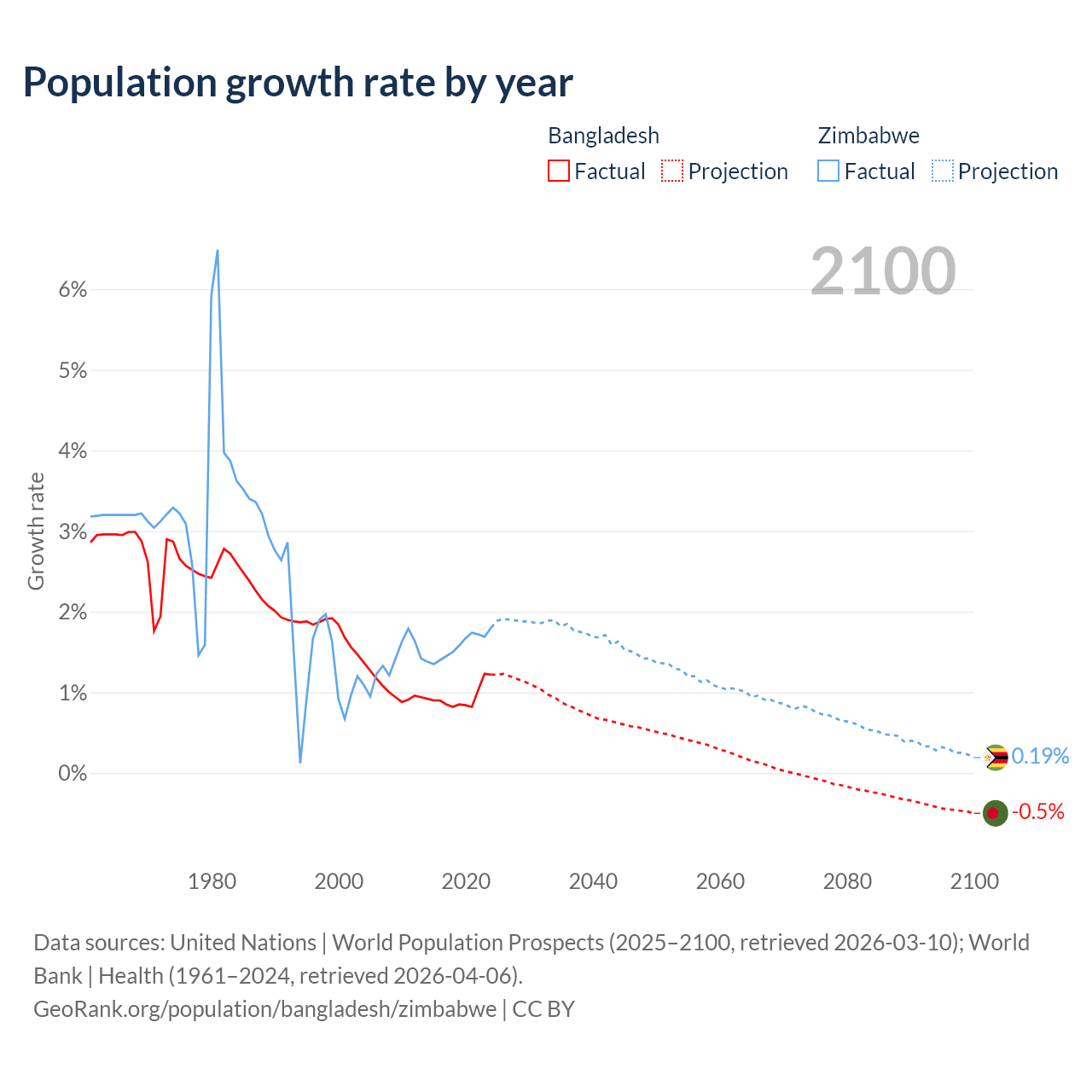 - For the last 10 years, Bangladesh has had an average growth rate of +0.94% per year vs +1.57% in Zimbabwe.