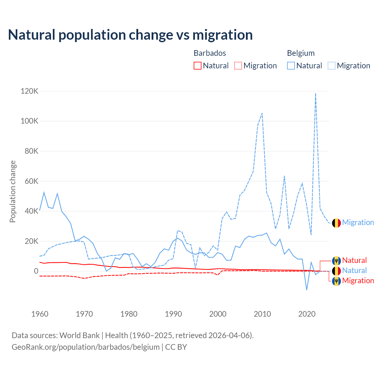 Over the last 10 years, 89.5% of the population change in Barbados is from natural causes (a gain of 4,936 people) and 10.5% is from migration (a loss of 578 people). In Belgium 11.3% is from natural causes (a gain of 64,346 people) and 88.7% is from migration (a gain of 504,240 people).