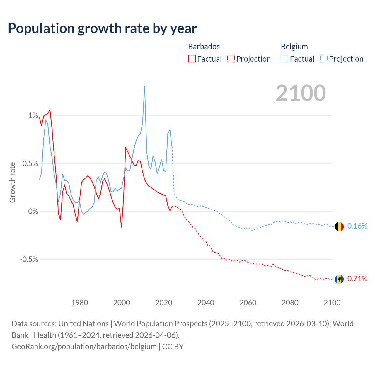 - For the last 10 years, Barbados has had an average growth rate of +0.16% per year vs +0.55% in Belgium.