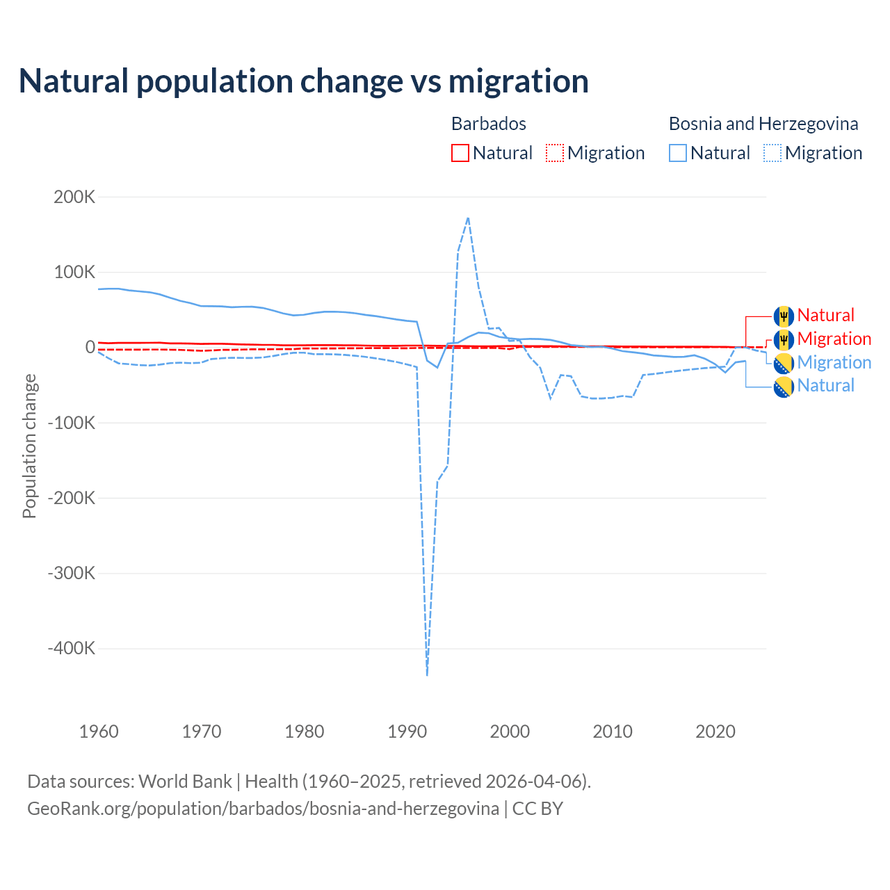 Over the last 10 years, 89.5% of the population change in Barbados is from natural causes (a gain of 4,936 people) and 10.5% is from migration (a loss of 578 people). In Bosnia and Herzegovina 41.1% is from natural causes (a loss of 169,384 people) and 58.9% is from migration (a loss of 243,117 people).