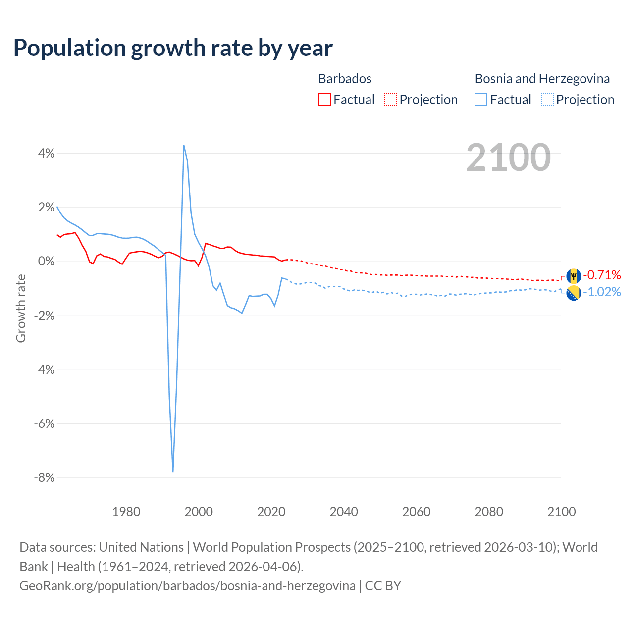 - For the last 10 years, Barbados has had an average growth rate of +0.16% per year vs -1.19% in Bosnia and Herzegovina.