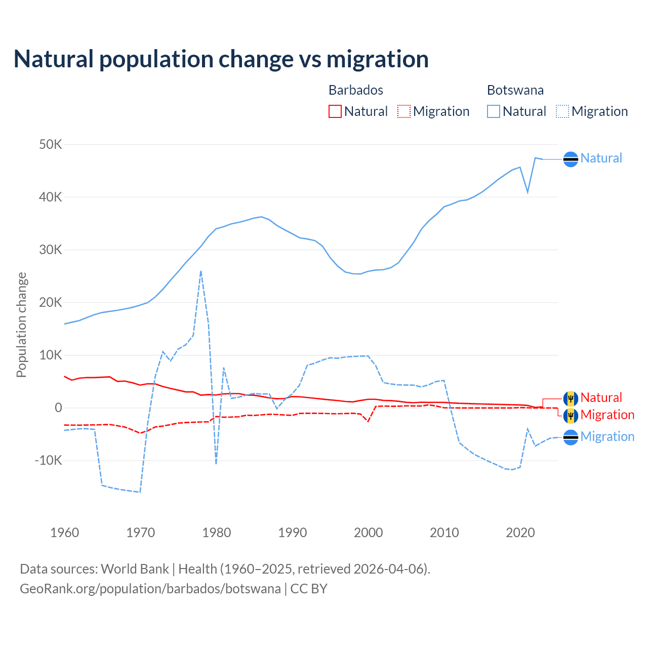 Over the last 10 years, 89.5% of the population change in Barbados is from natural causes (a gain of 4,936 people) and 10.5% is from migration (a loss of 578 people). In Botswana 82.5% is from natural causes (a gain of 436,373 people) and 17.5% is from migration (a loss of 92,293 people).
