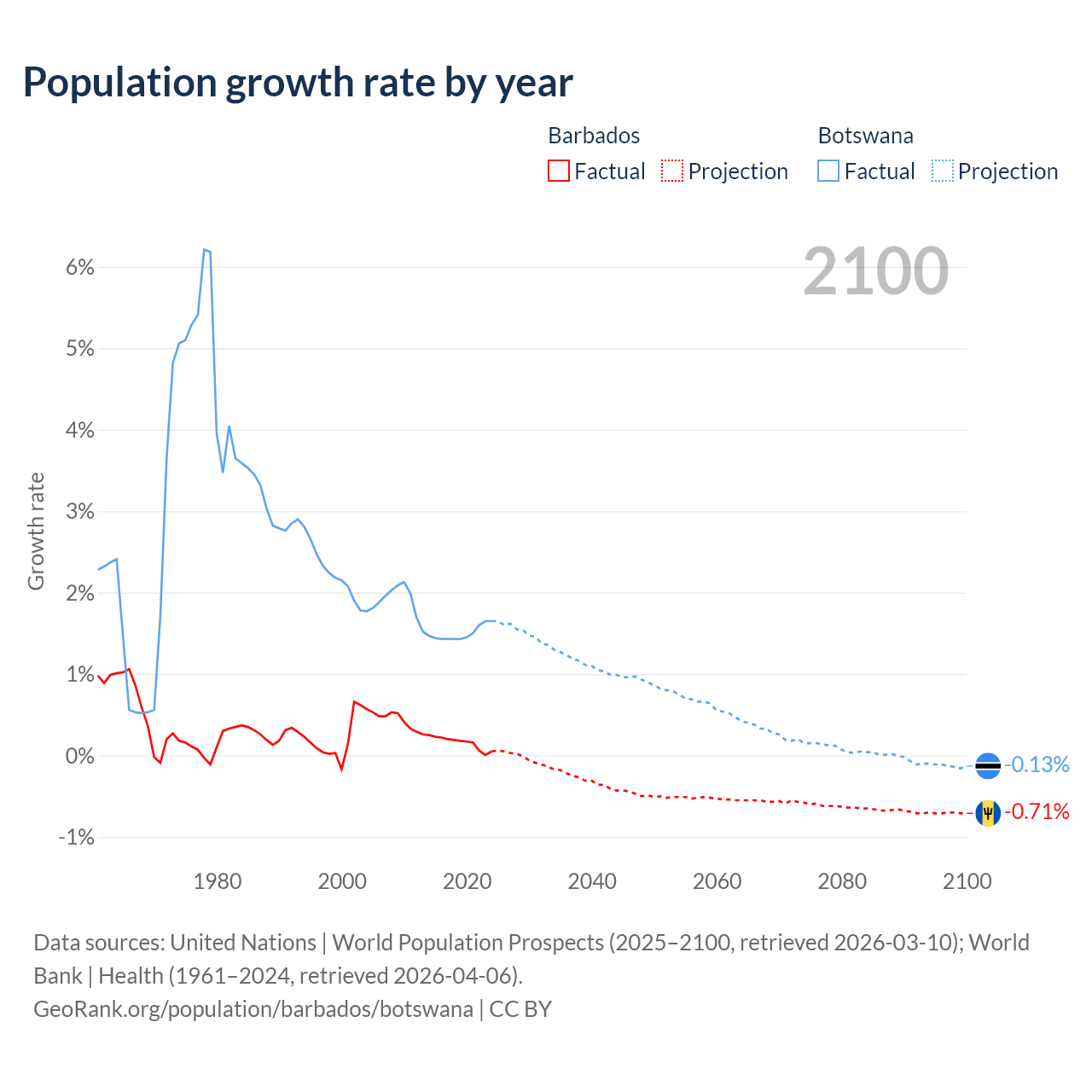 - For the last 10 years, Barbados has had an average growth rate of +0.16% per year vs +1.5% in Botswana.