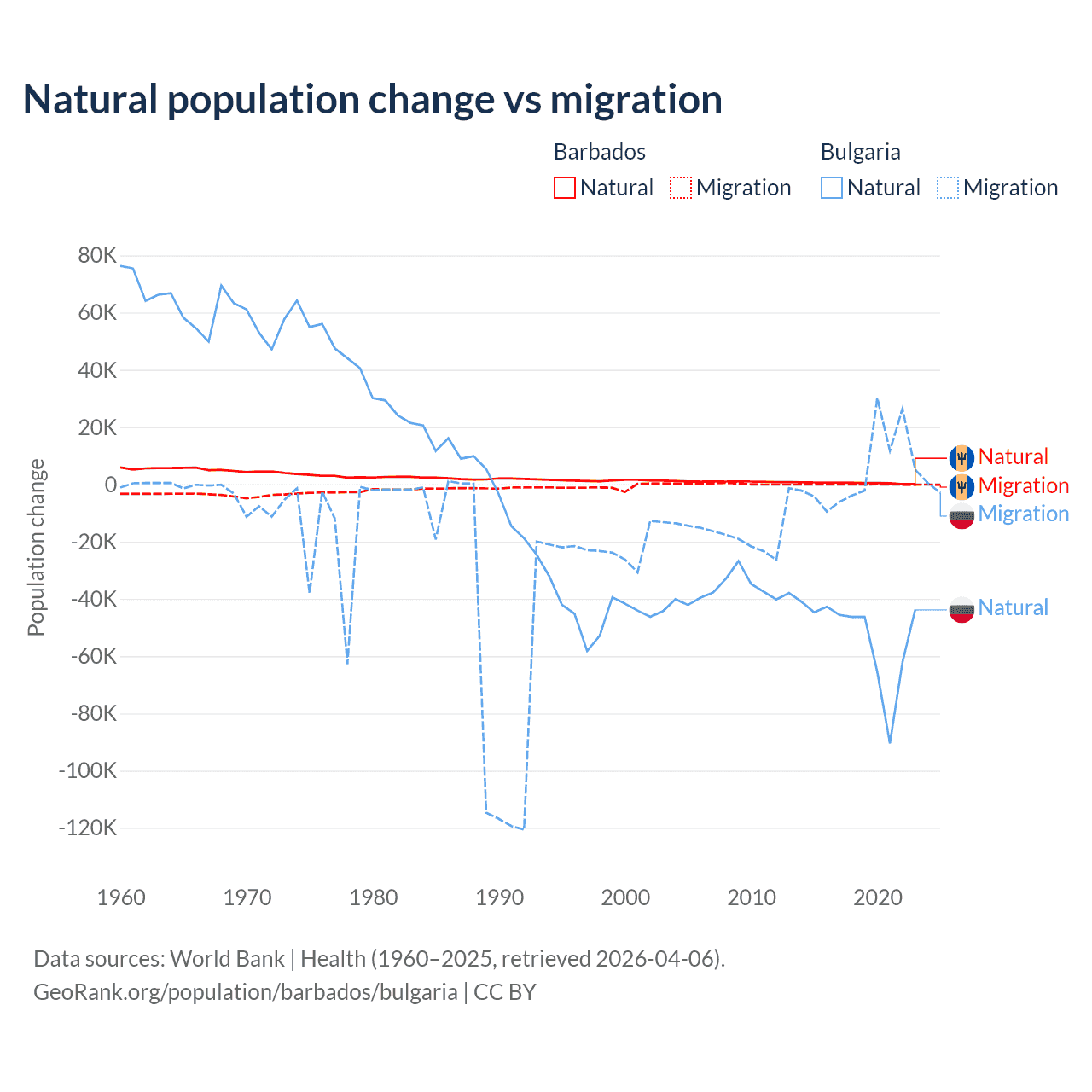 Over the last 10 years, 89.5% of the population change in Barbados is from natural causes (a gain of 4,936 people) and 10.5% is from migration (a loss of 578 people). In Bulgaria 92.1% is from natural causes (a loss of 528,535 people) and 7.94% is from migration (a gain of 45,567 people).