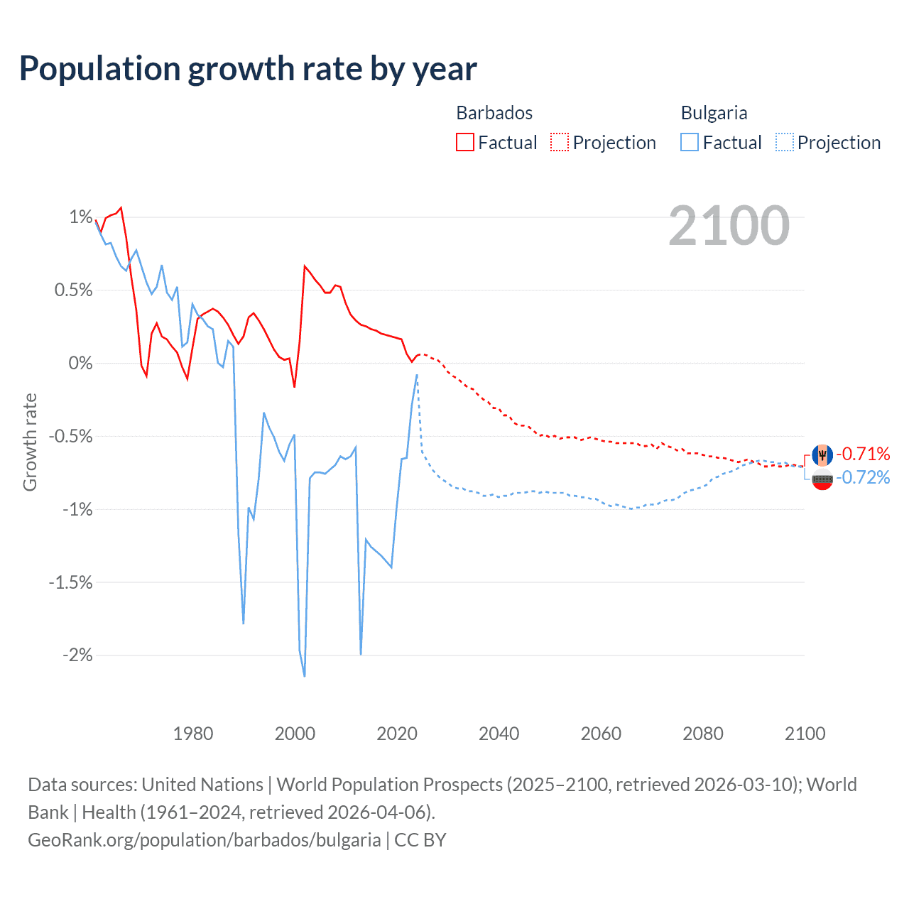 - For the last 10 years, Barbados has had an average growth rate of +0.16% per year vs -0.96% in Bulgaria.