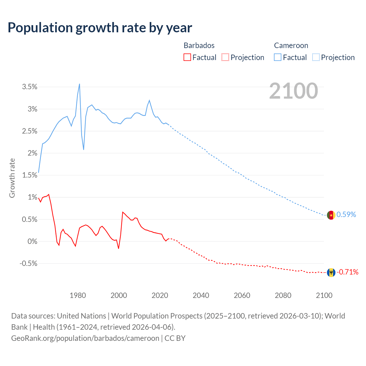 - For the last 10 years, Barbados has had an average growth rate of +0.16% per year vs +2.84% in Cameroon.