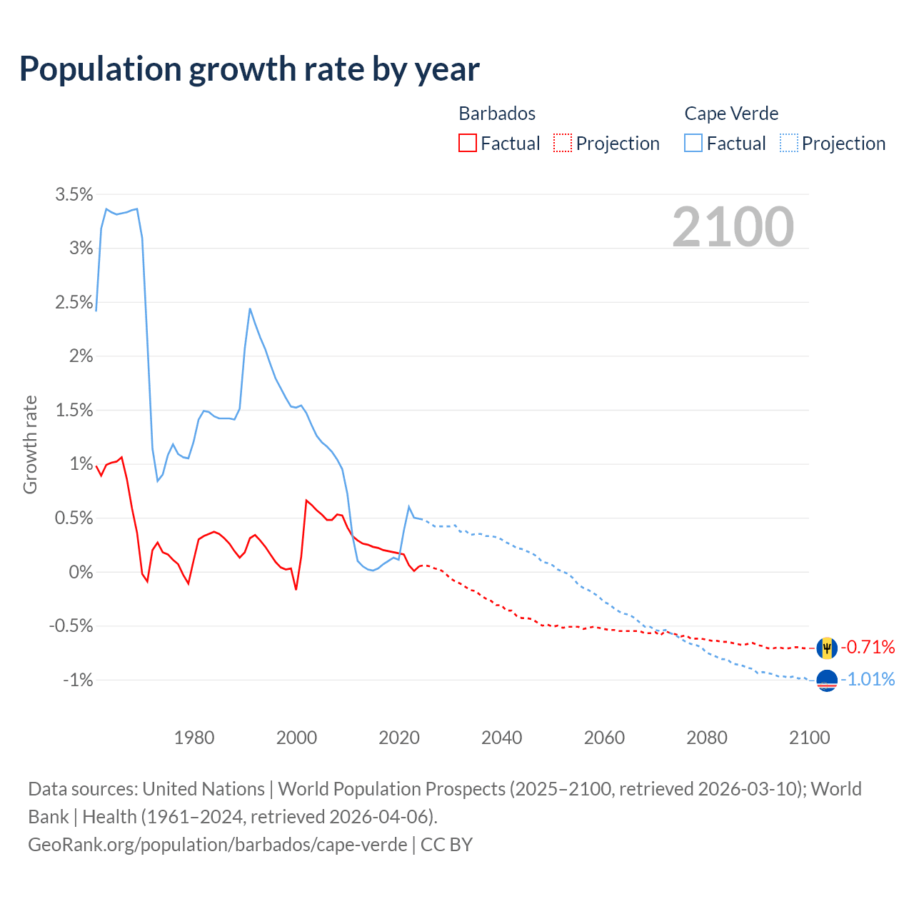 Barbados vs Cape Verde: population by year and forecast