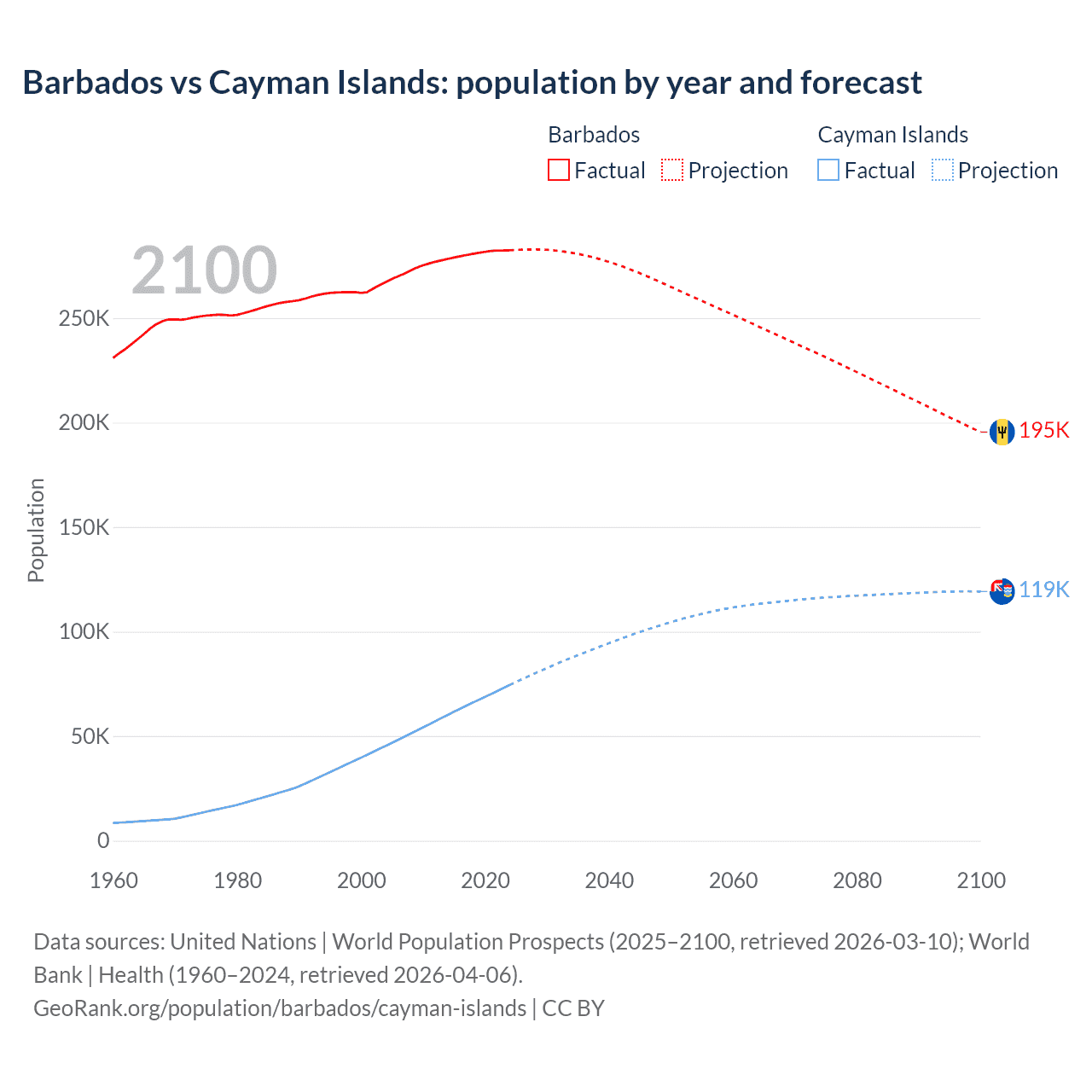 Barbados vs Cayman Islands: population by year and forecast