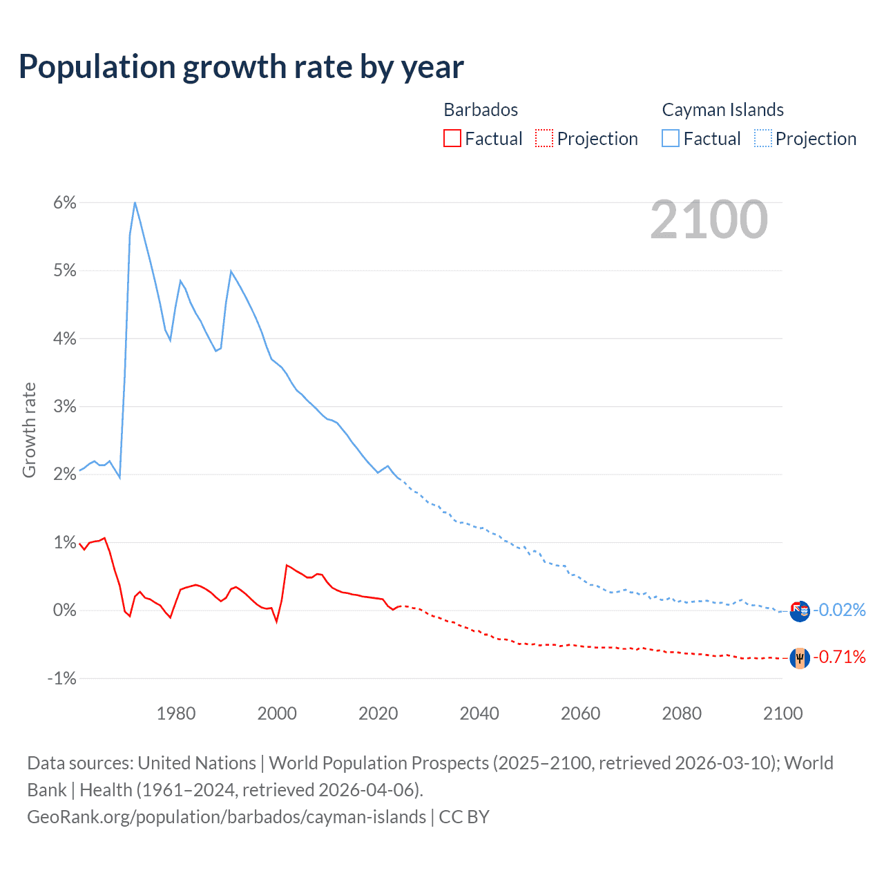 - For the last 10 years, Barbados has had an average growth rate of +0.16% per year vs +2.19% in the Cayman Islands.
