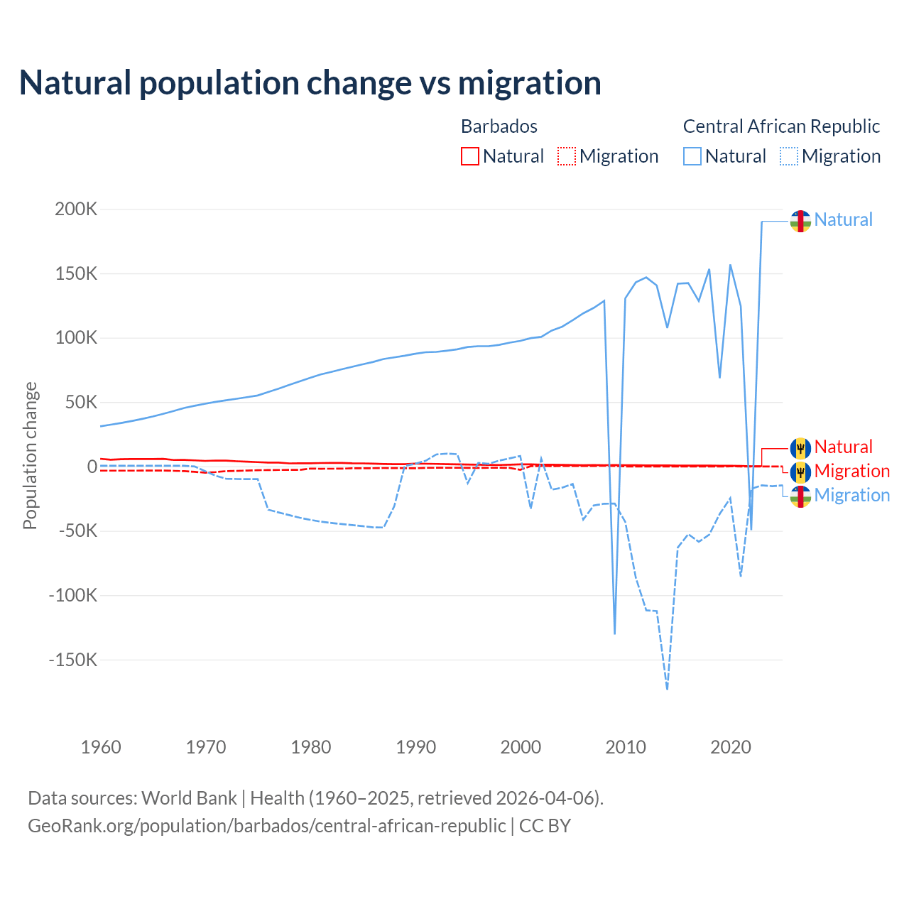 Over the last 10 years, 89.5% of the population change in Barbados is from natural causes (a gain of 4,936 people) and 10.5% is from migration (a loss of 578 people). In the Central African Republic 66.7% is from natural causes (a gain of 1,164,312 people) and 33.3% is from migration (a loss of 580,593 people).